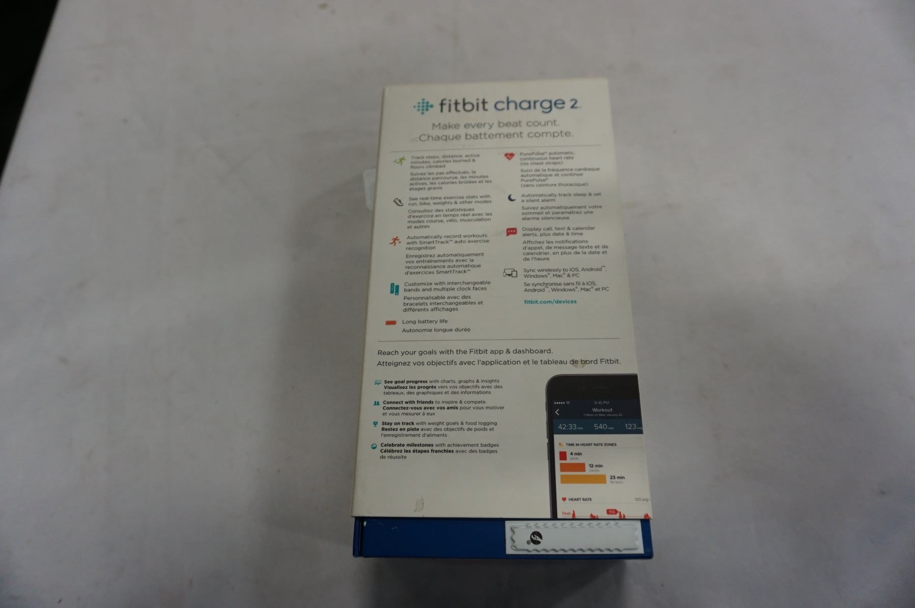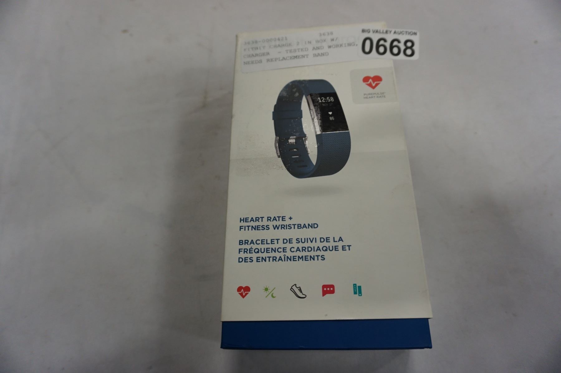 FITBIT CHARGE 2 IN BOX W/ CHARGER - TESTED AND WORKING, NEEDS REPLACEMENT BAND