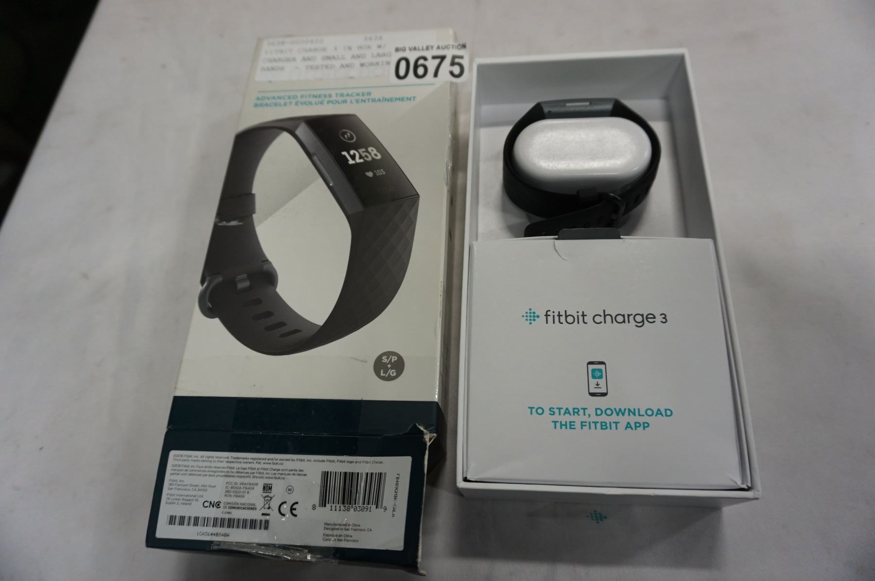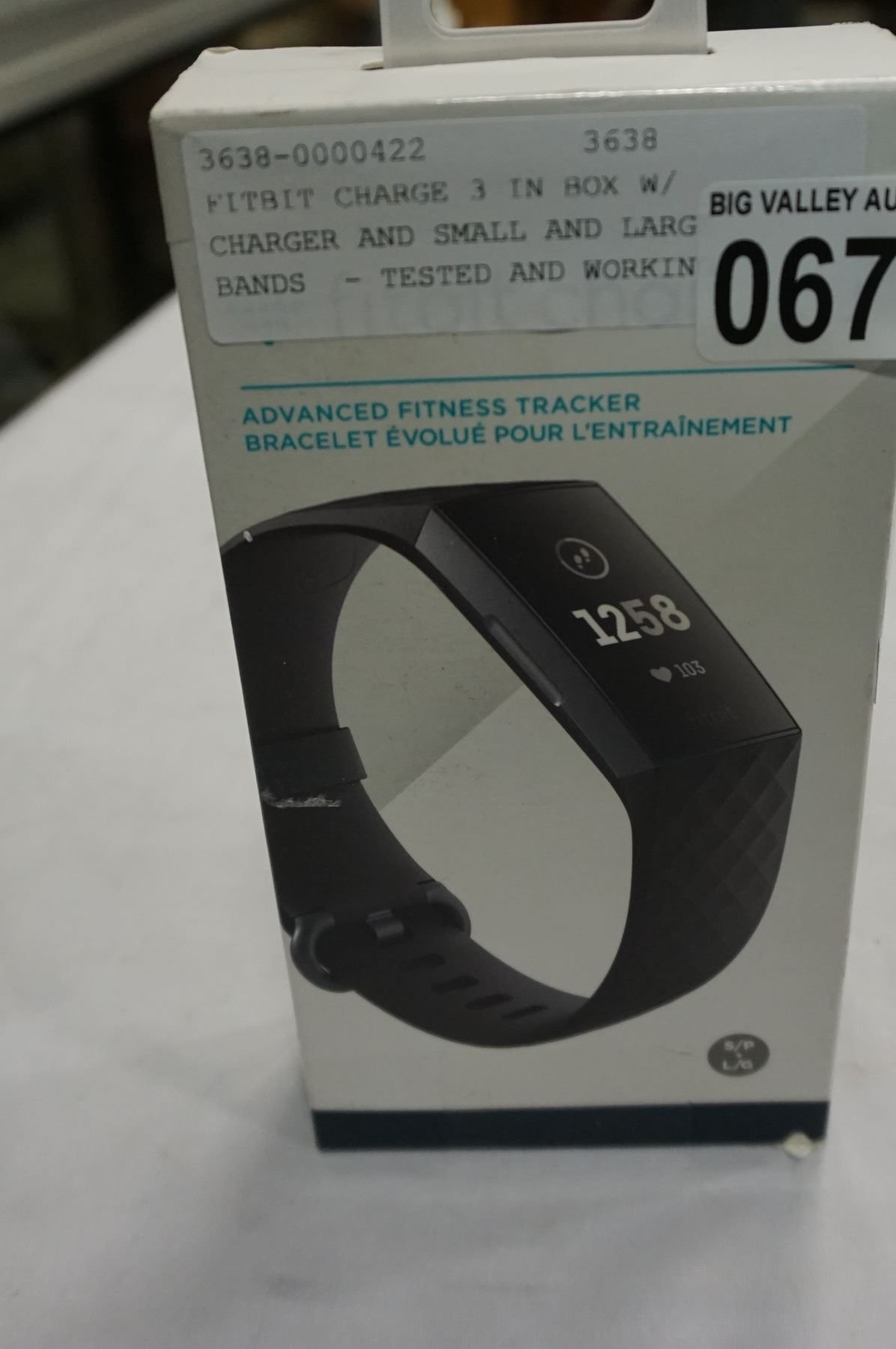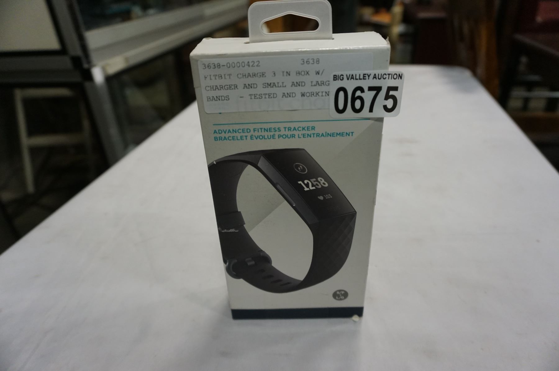 FITBIT CHARGE 3 IN BOX W/ CHARGER AND SMALL AND LARGE BANDS - TESTED AND WORKING