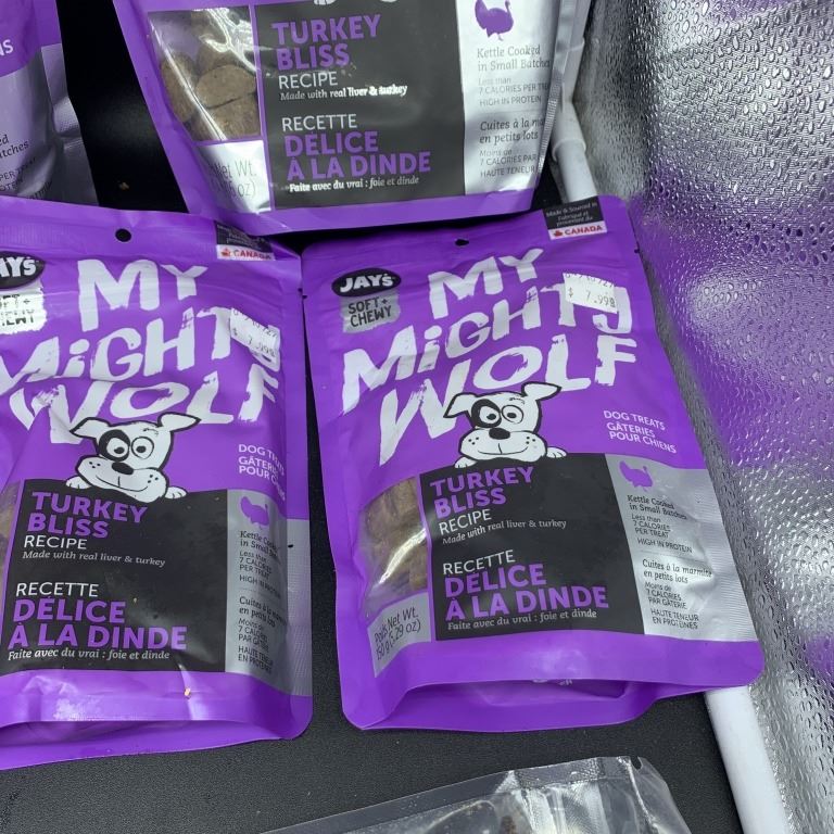 FIVE BAGS OF MY MIGHTY WOLF TURKEY BLISS DOG TREATS WITH PORK JERKY STICKS, BEEF LUNG BITES, SAUSAGE