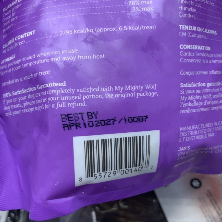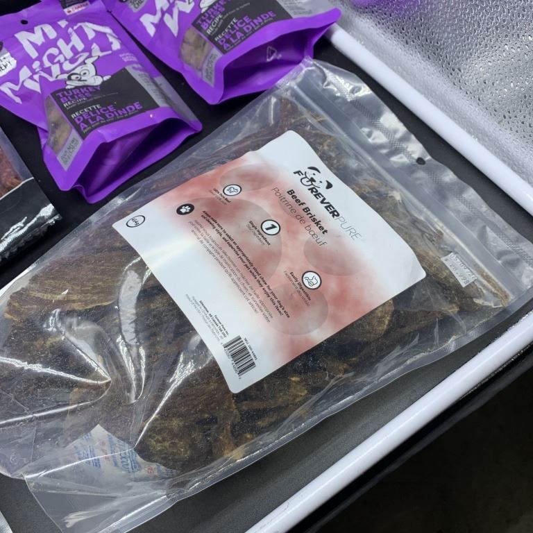 FIVE BAGS OF MY MIGHTY WOLF TURKEY BLISS DOG TREATS WITH PORK JERKY STICKS, BEEF LUNG BITES, SAUSAGE BITES AND BEEF BRISKET CHEWS BEST BEFORE 2027