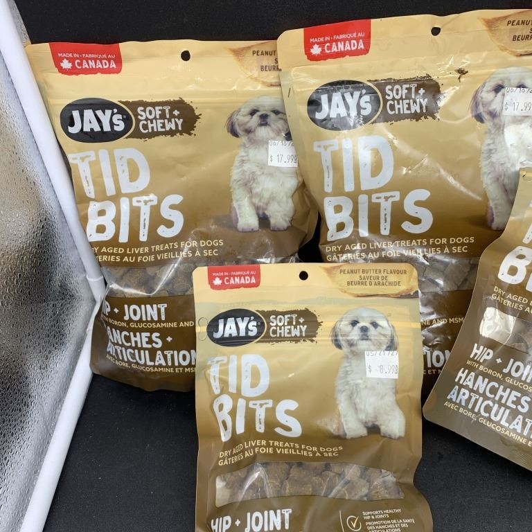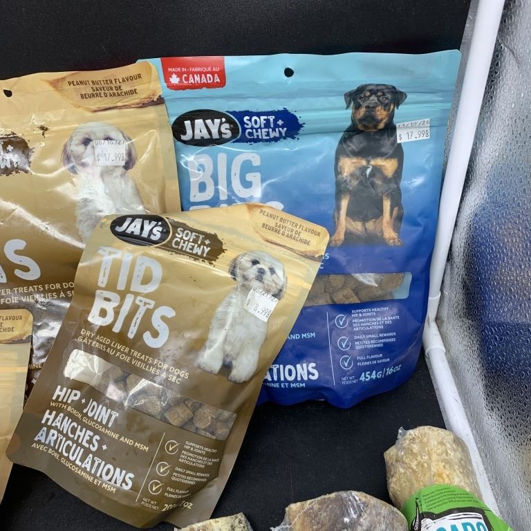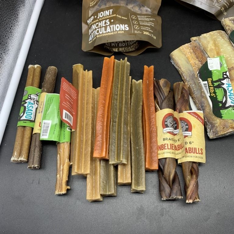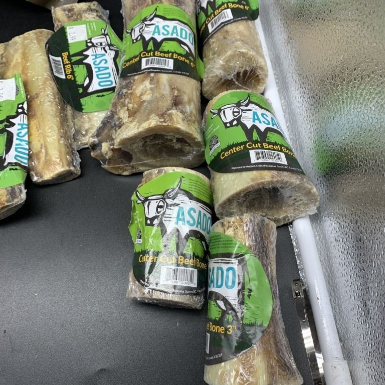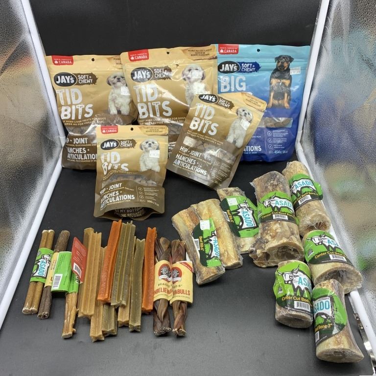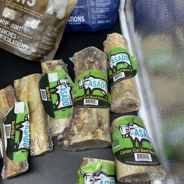 FIVE BAGS OF NEW DRY AGED LIVER TREATS TIDBITS AND BIG BITS, BEEF RIBS, BEEF BONES, AND BEEF CHEWS