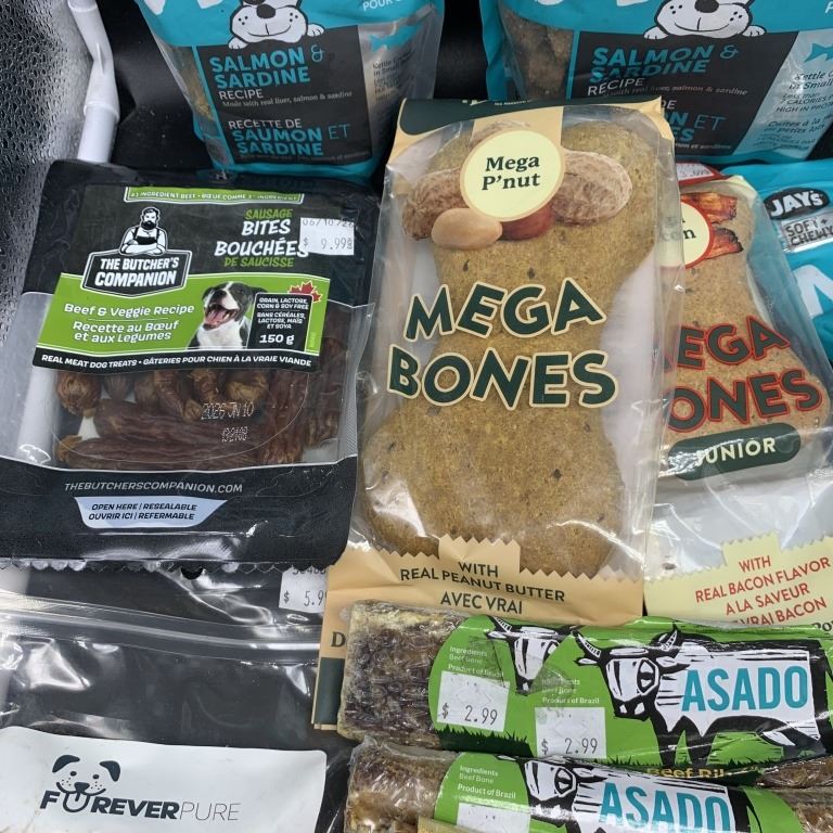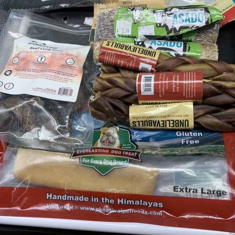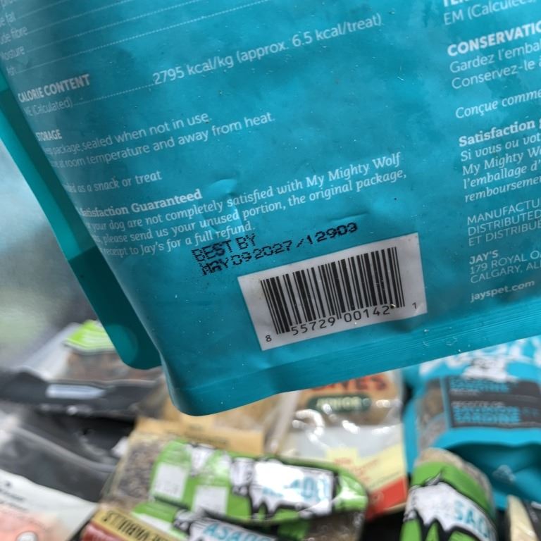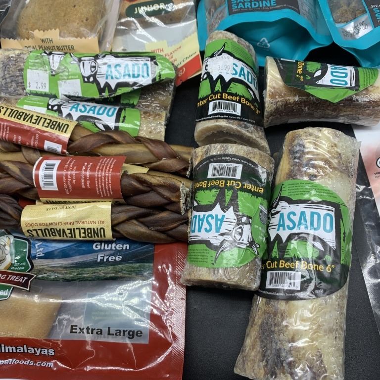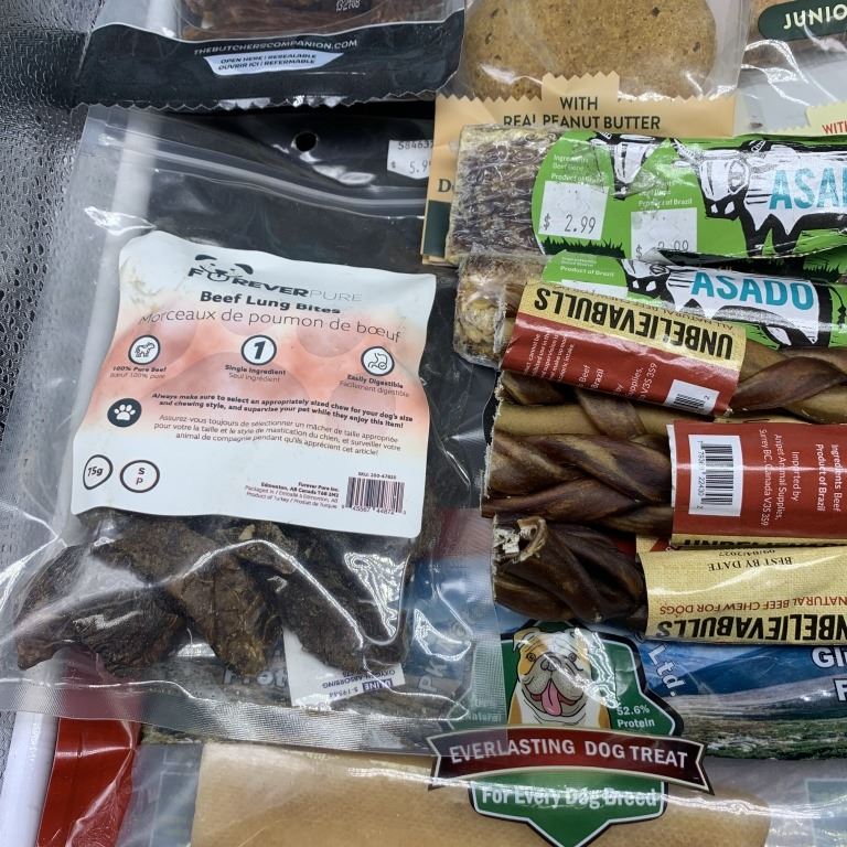 FIVE BAGS OF NEW MY MIGHTY WOLF SALMON AND SARDINE RECIPE DOG TREATS WITH SAUSAGE BITES, MEGA BONES, BEEF BONES, BEEF RIBS, BEEF BRISKET, BEEF CHEWS AND EVERLASTING DOG TREAT BEST BEFORE 2026/2027