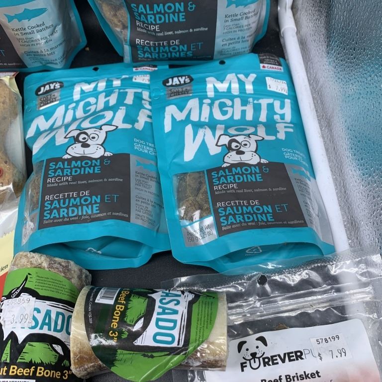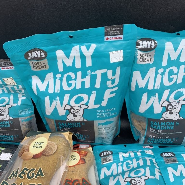 FIVE BAGS OF NEW MY MIGHTY WOLF SALMON AND SARDINE RECIPE DOG TREATS WITH SAUSAGE BITES, MEGA BONES,