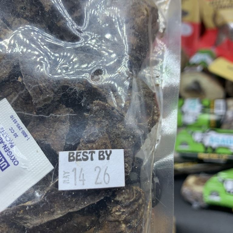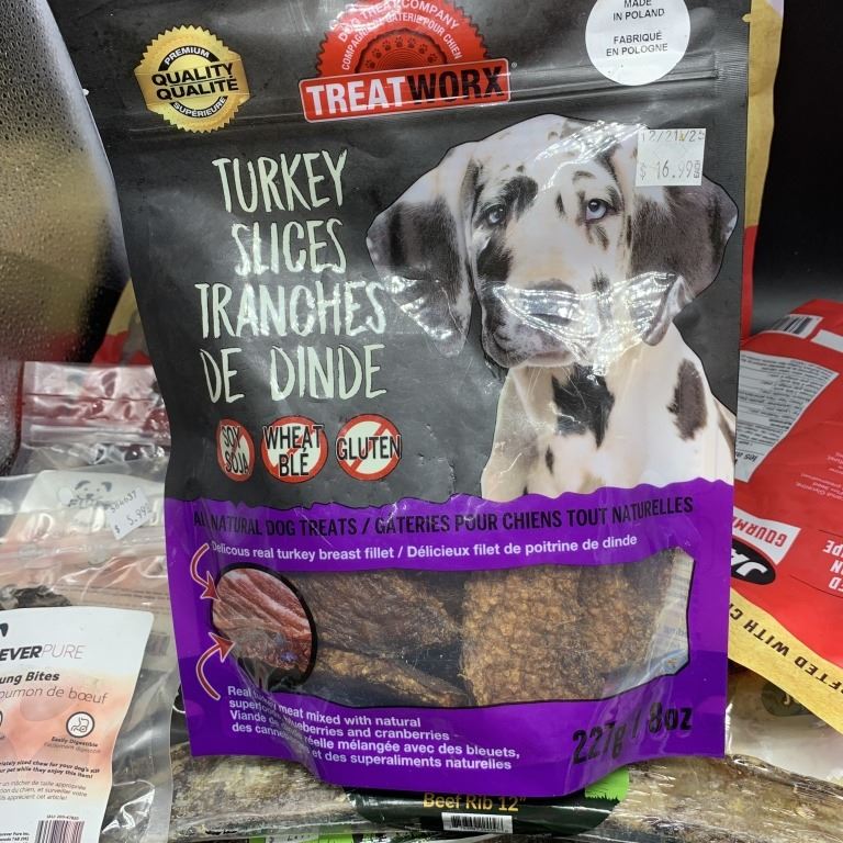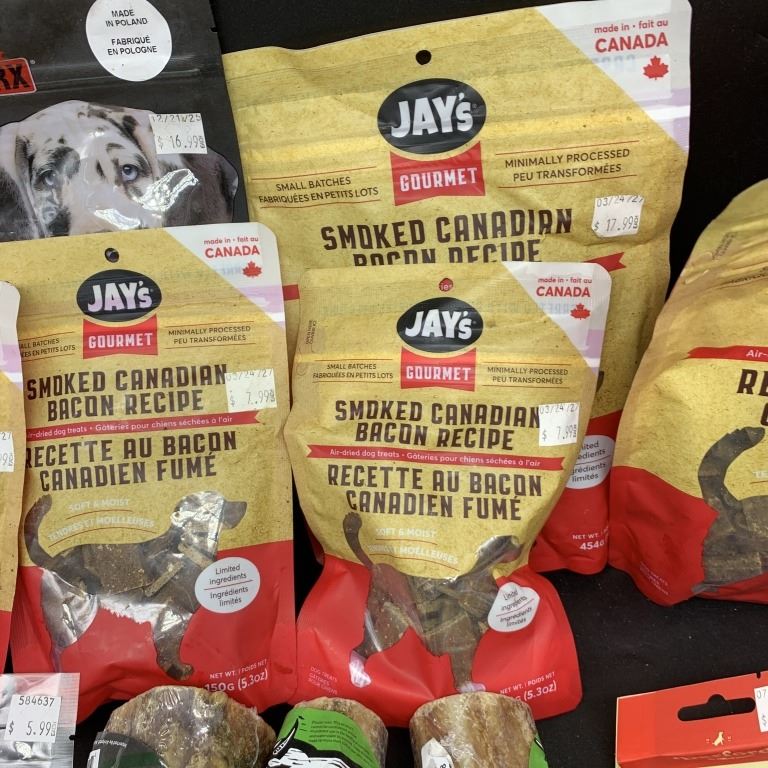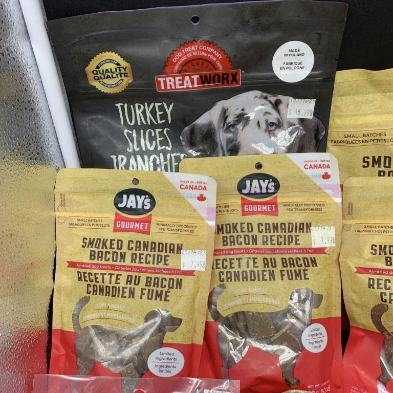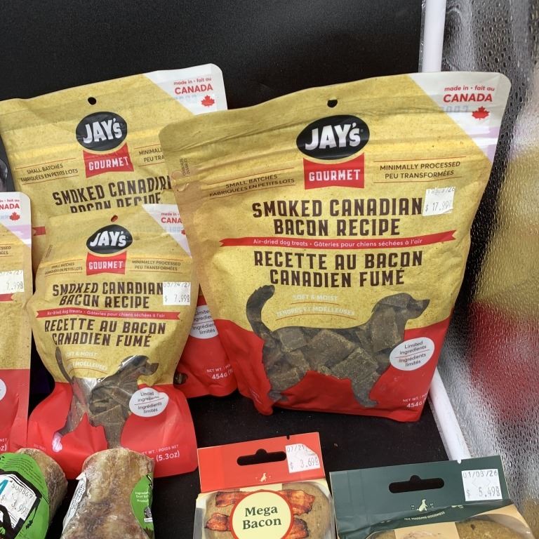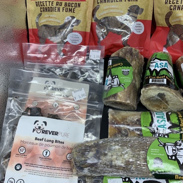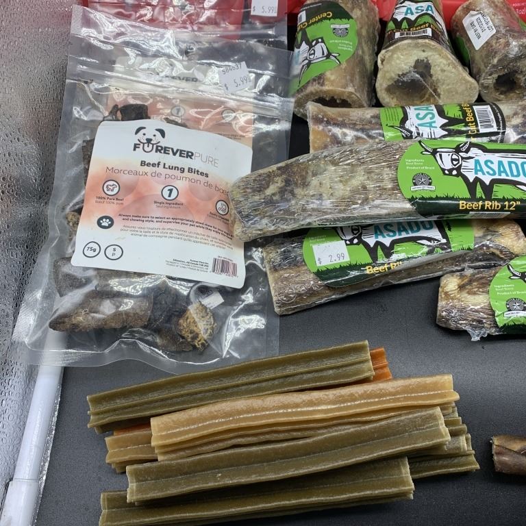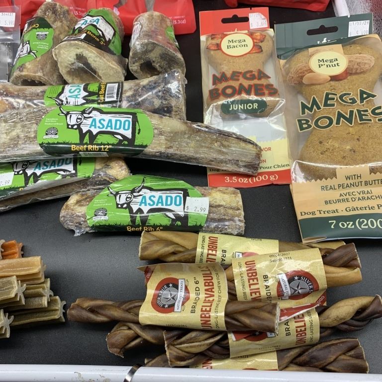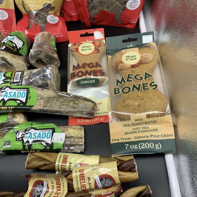 FIVE BAGS OF SMOKED CANADIAN BACON AIR DRIED DOG TREATS WITH TURKEY SLICES DOG TREAT, BEEF LONG BITES, BEEF RIBS, BEEF BONES, MEGA BONES, AND LONG LASTING BEEF CHEWS BEST BEFORE 2026