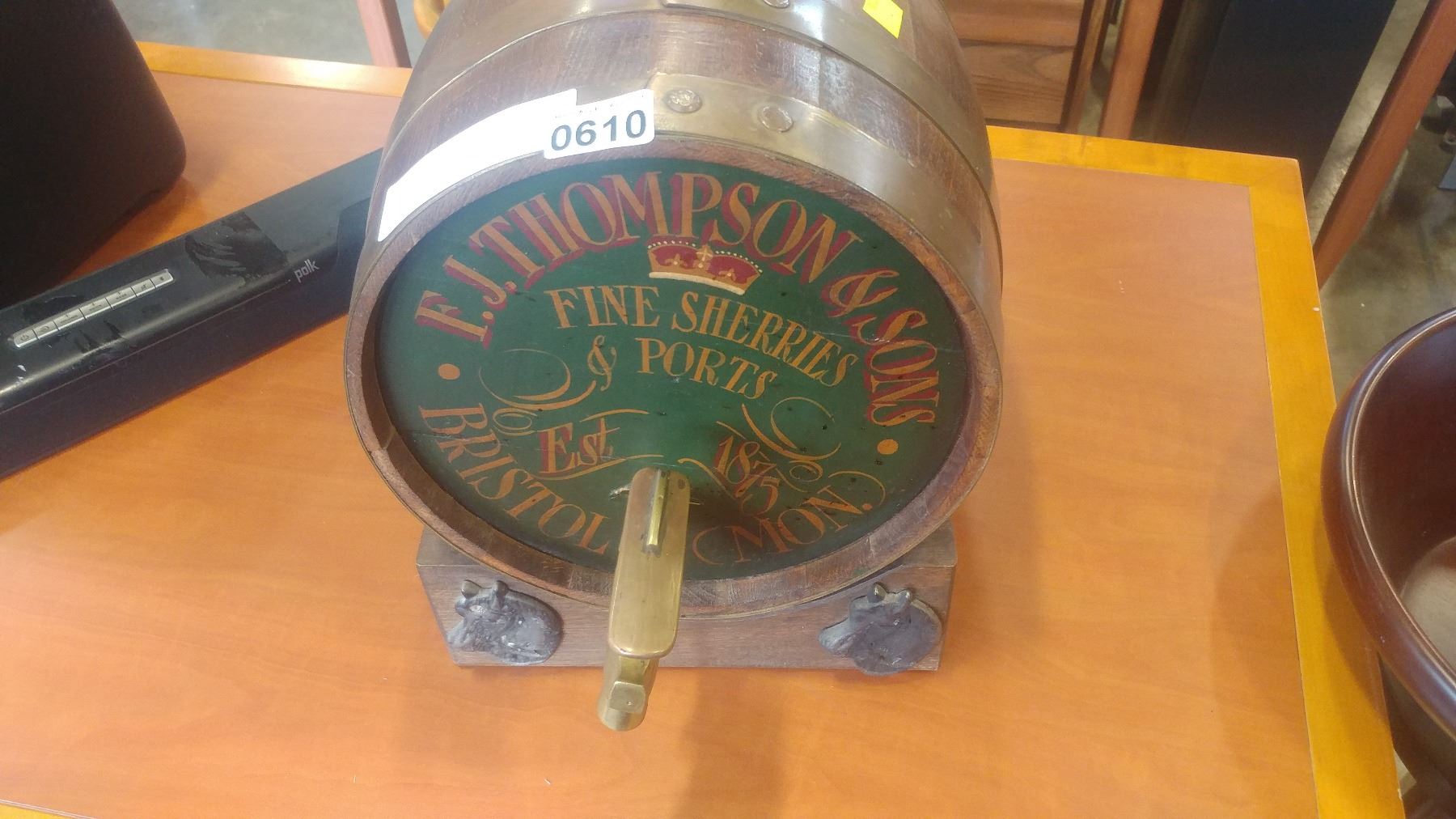 FJ THOMPSON AND SONS WOOD AND BRASS KEG ON STAND