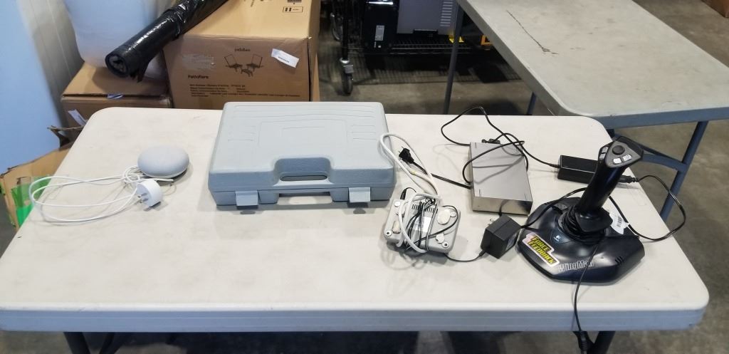 FLIGHT JOYSTICK, CORDLESS DRILL, GOOGLE HOME, ROUTER AND POWERED DRIVE