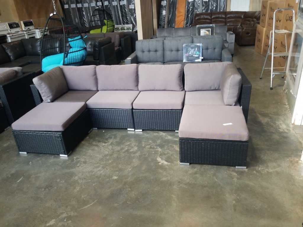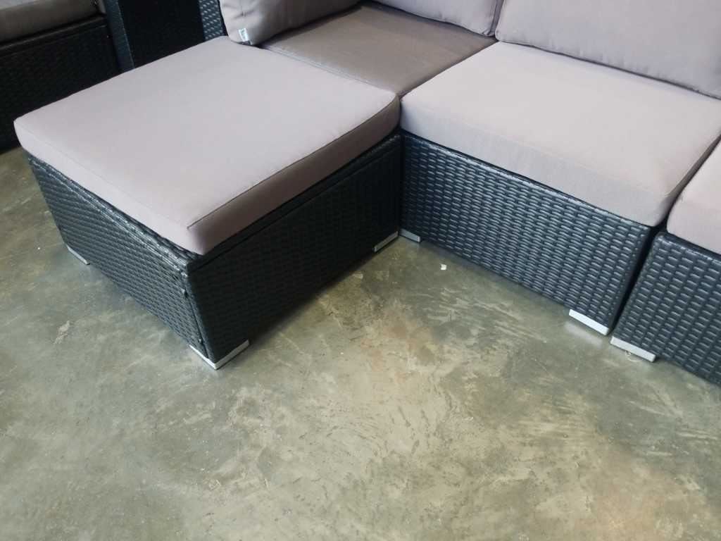 FLOOR MODEL RATTAN OUTDOOR 6 PIECE MODULAR SECTIONAL SOFA W/ DARK GREY CUSHIONS - RETAIL $1499 POWDER COATED STEEL FRAME AND REMOVABLE WASHABLE CUSHIONS