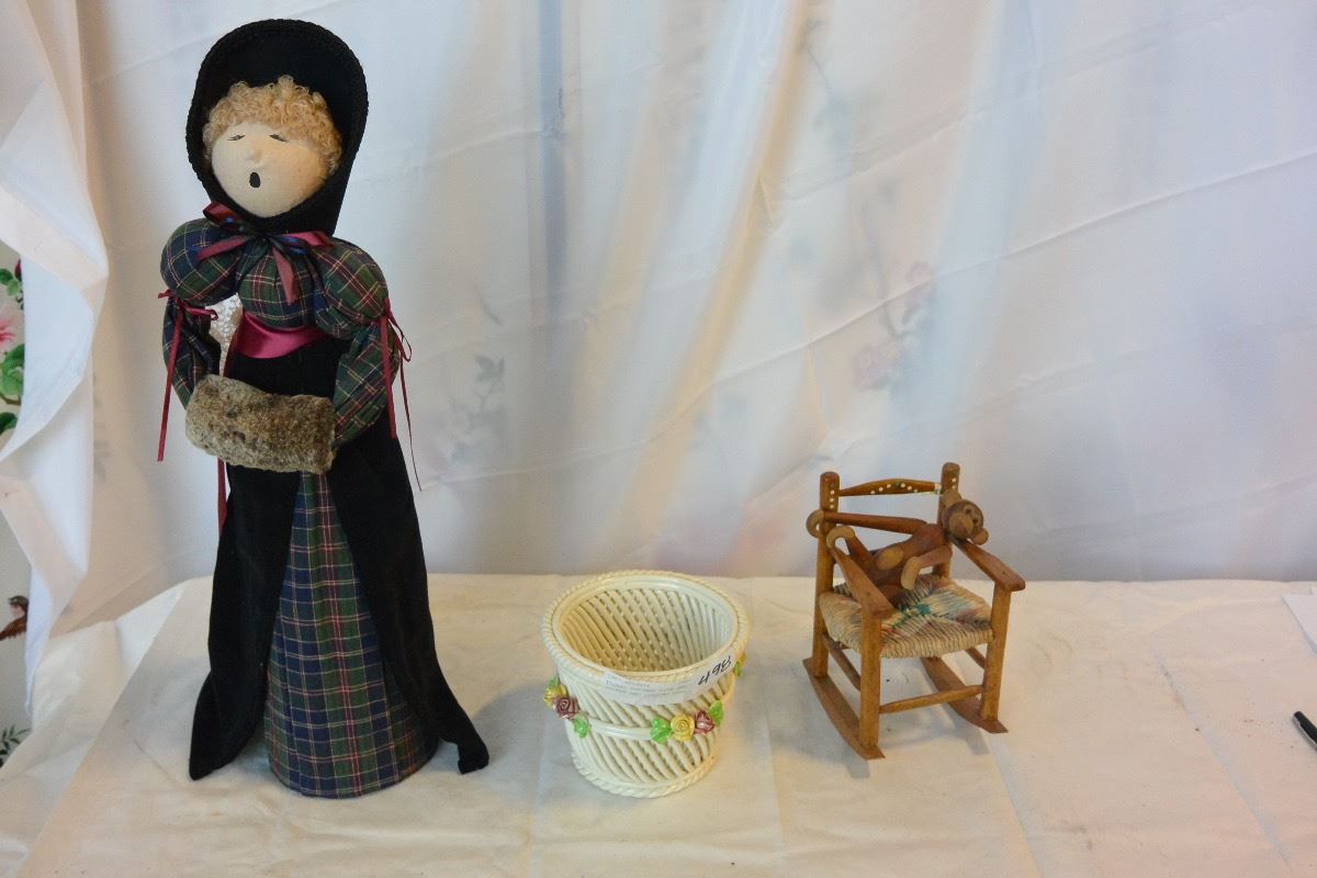FLORAL POTTERY DISH AND TOY ROCKER AND SINGING DOLL