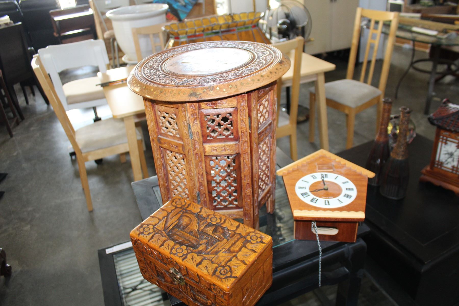 FOLDING EASTERN TABLE AND CARVED EASTERN BOX AND CUCKOO CLOCK NO WEIGHTS