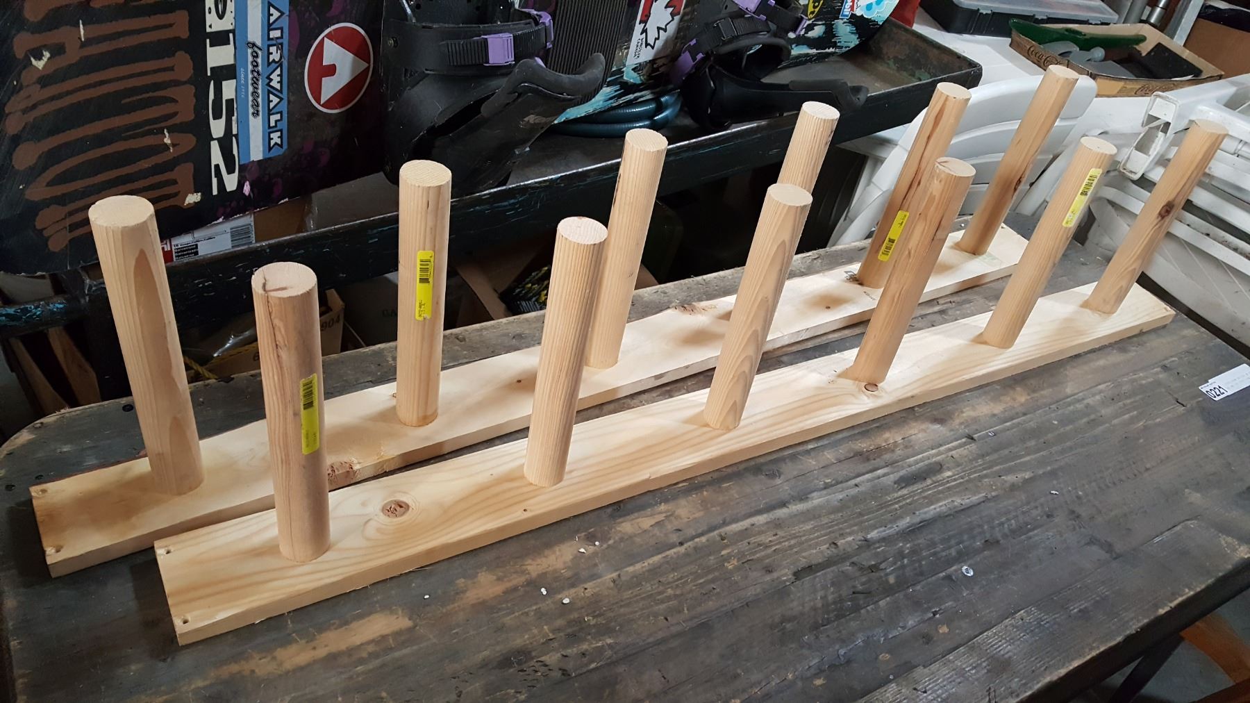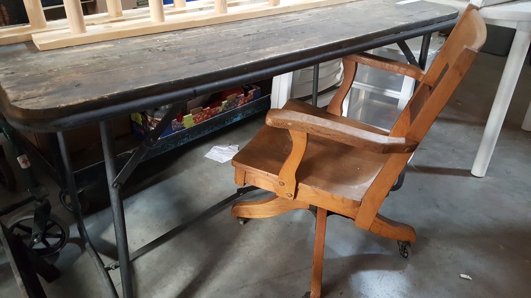 FOLDING WOOD TABLE AND TWO PEG RACKS W/ ROLLING WOOD CHAIR