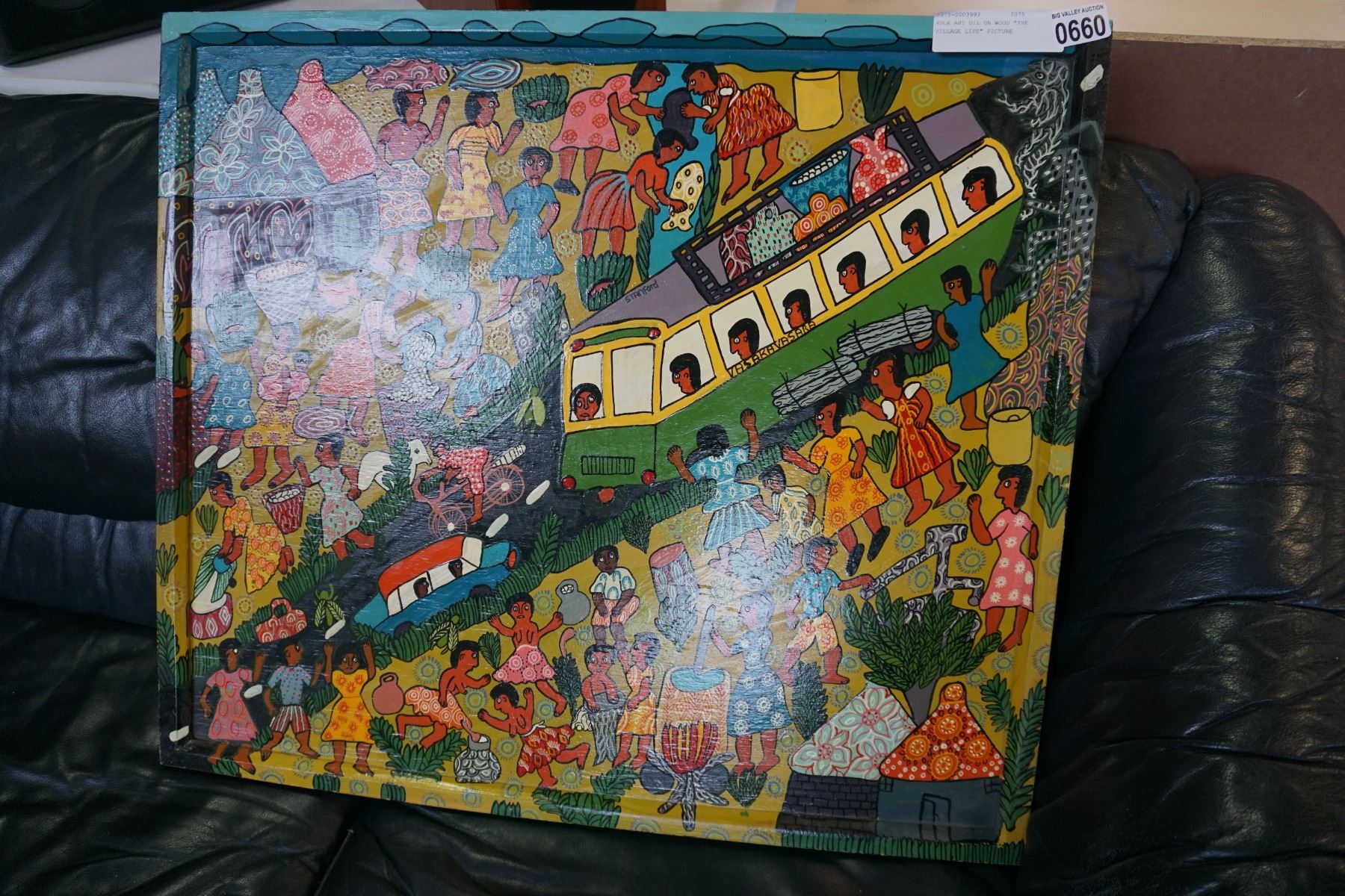 FOLK ART OIL ON WOOD "THE VILLAGE LIFE" PICTURE