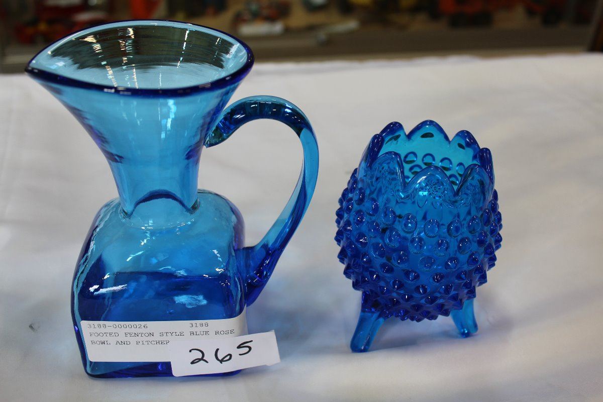 FOOTED FENTON STYLE BLUE ROSE BOWL AND PITCHER