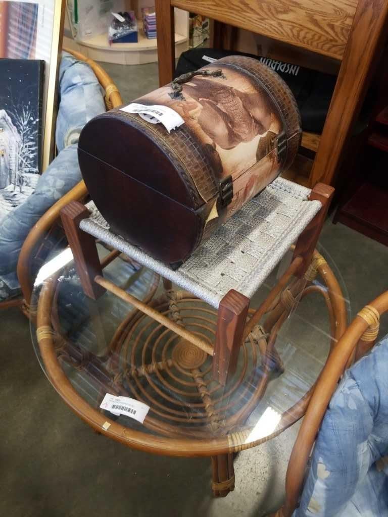 FOOTSTOOL AND VINTAGE STORAGE TRUNK