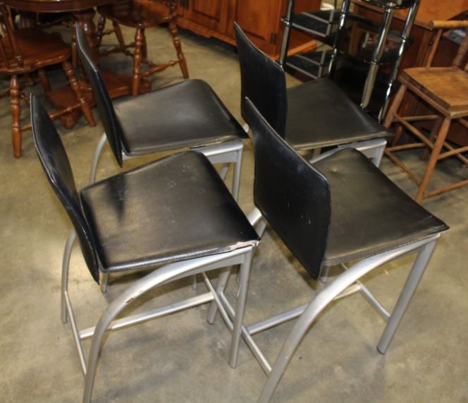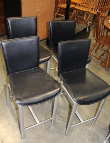 FOUR BLACK LEATHER AND METAL BAR STOOLS