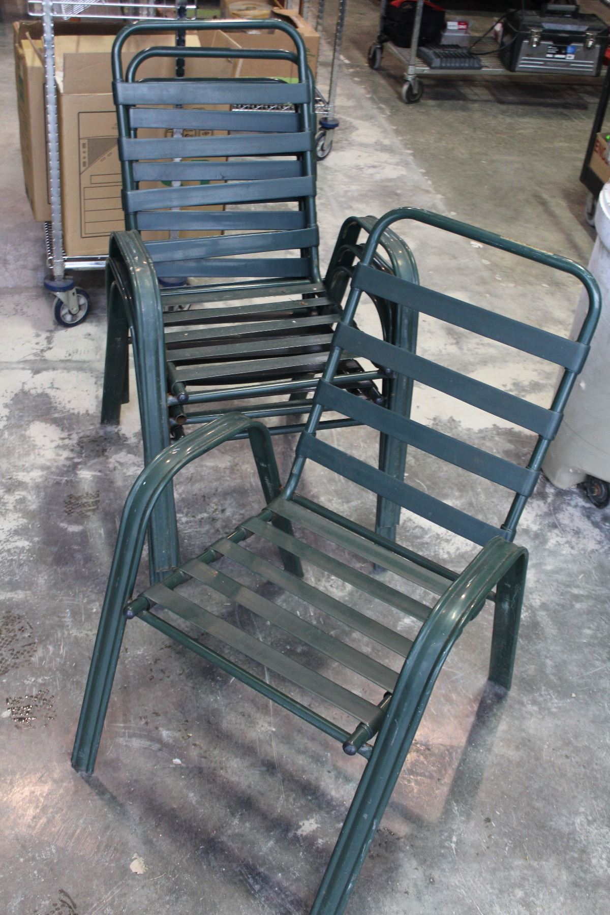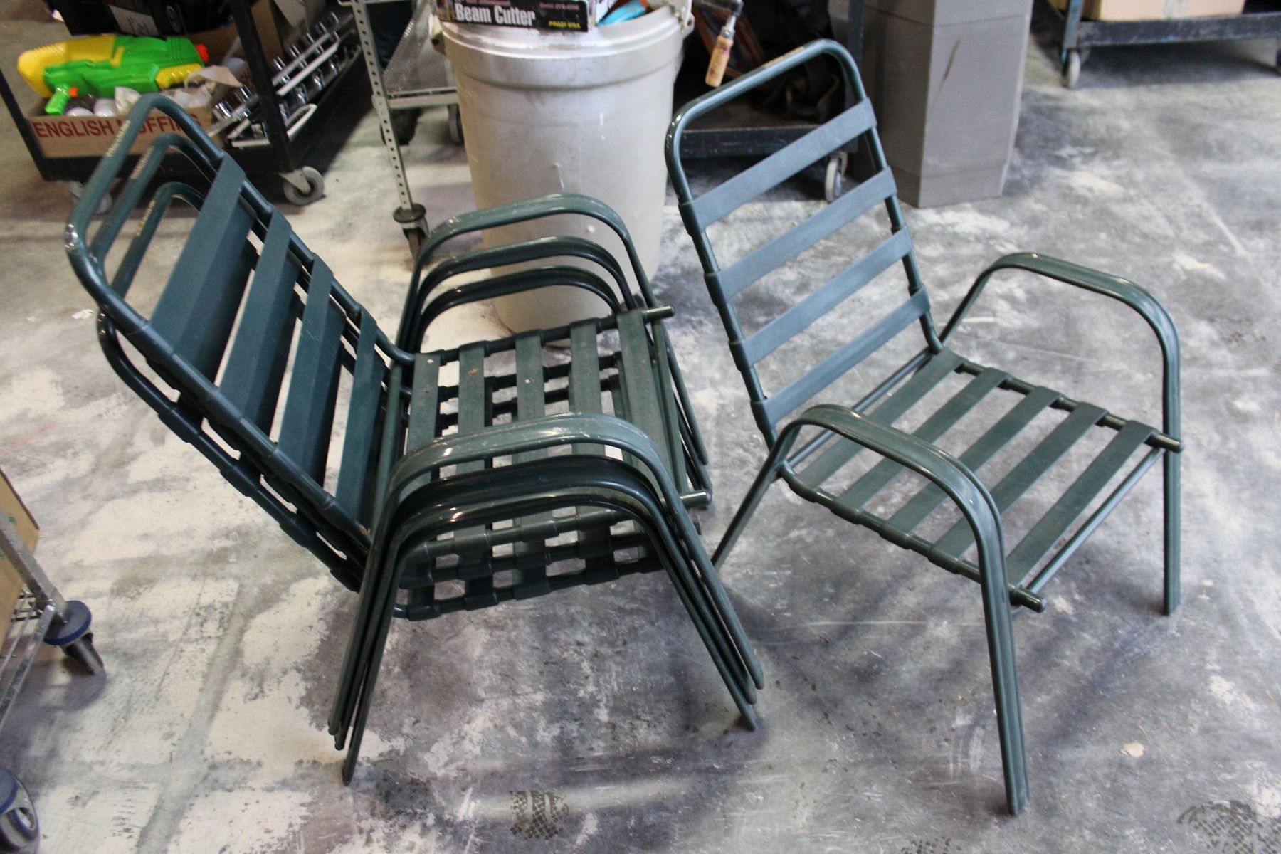 FOUR GREEN METAL STACKING CHAIRS