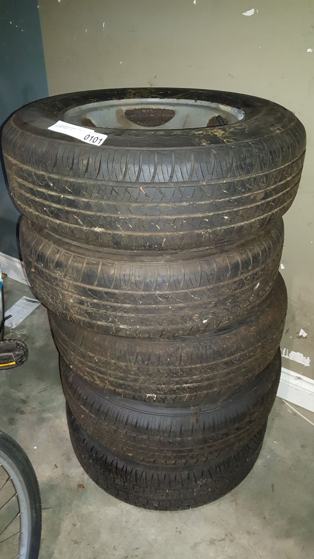 FOUR HANKOOK 14 INCH TIRES ON RIMS AND SPARE TIRE