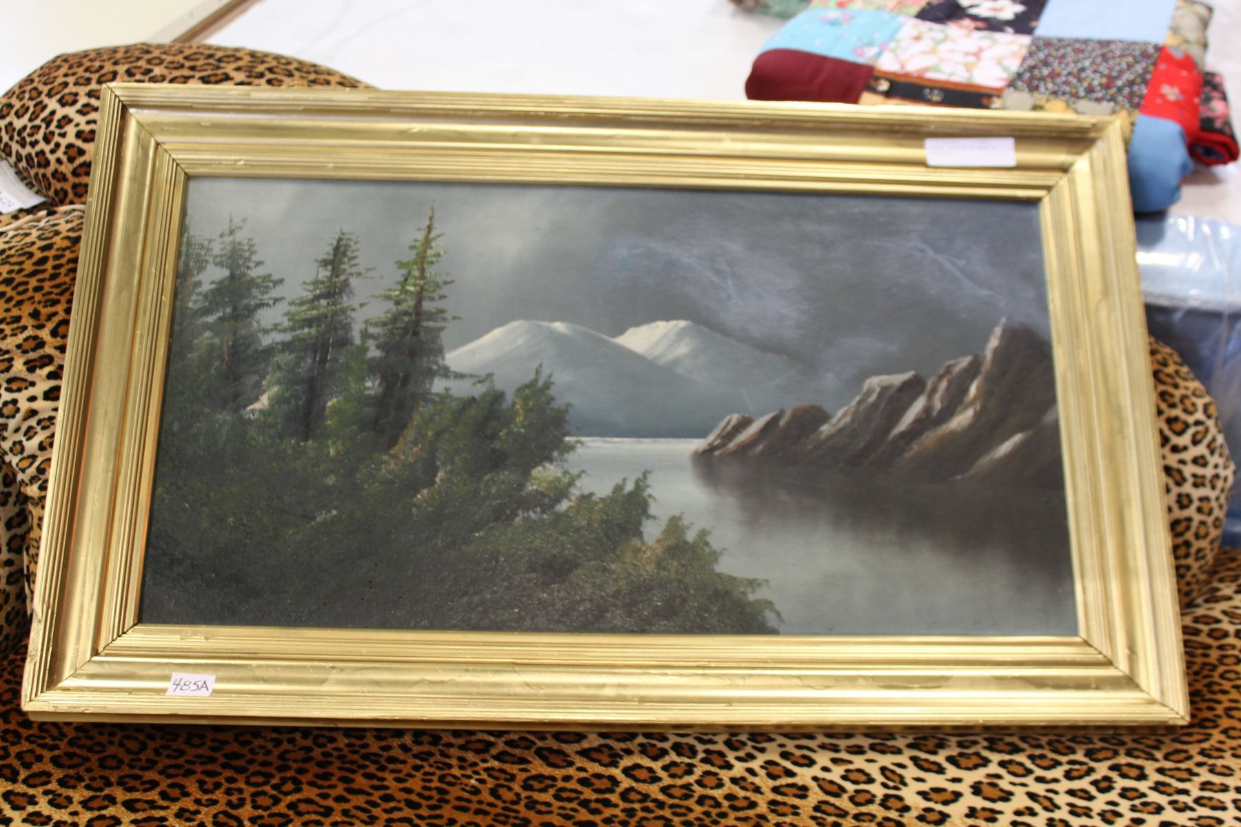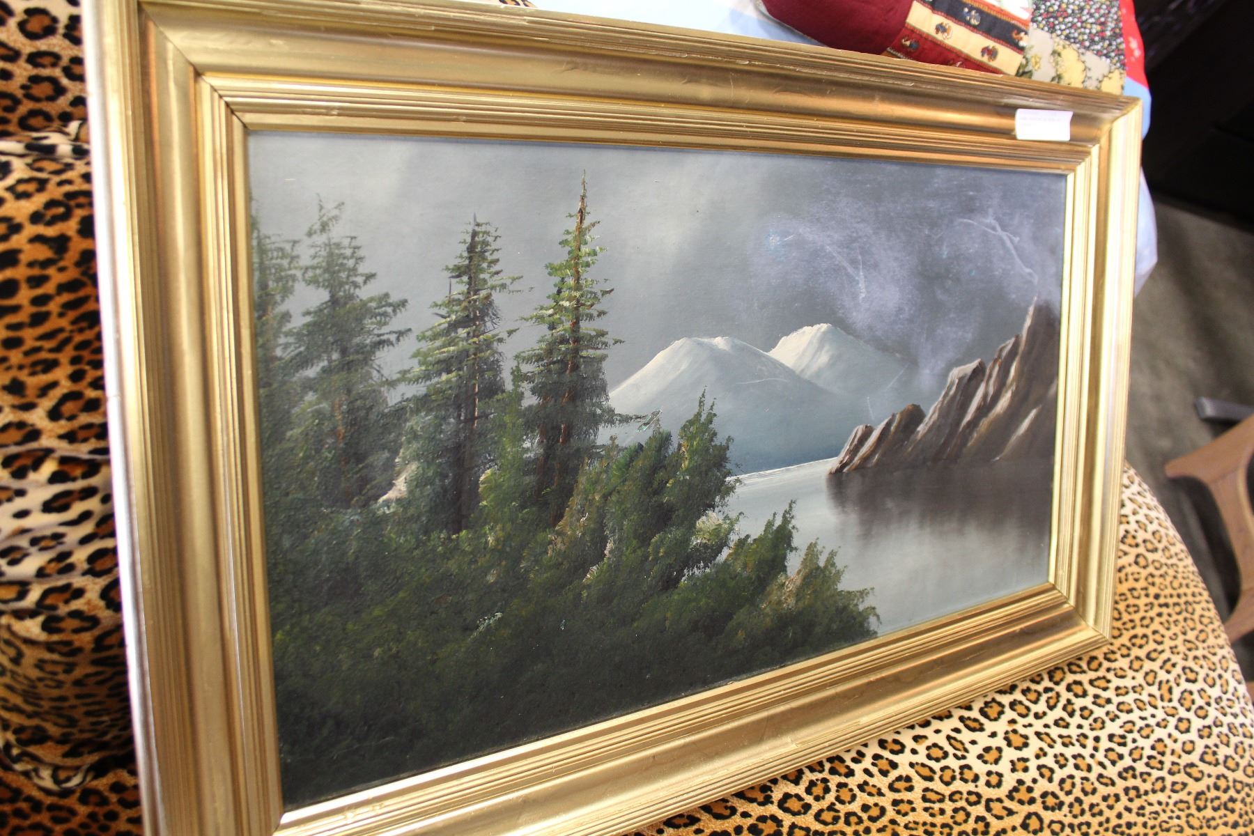 FRAMED PAINTING ON BOARD OF MOUNTAINS