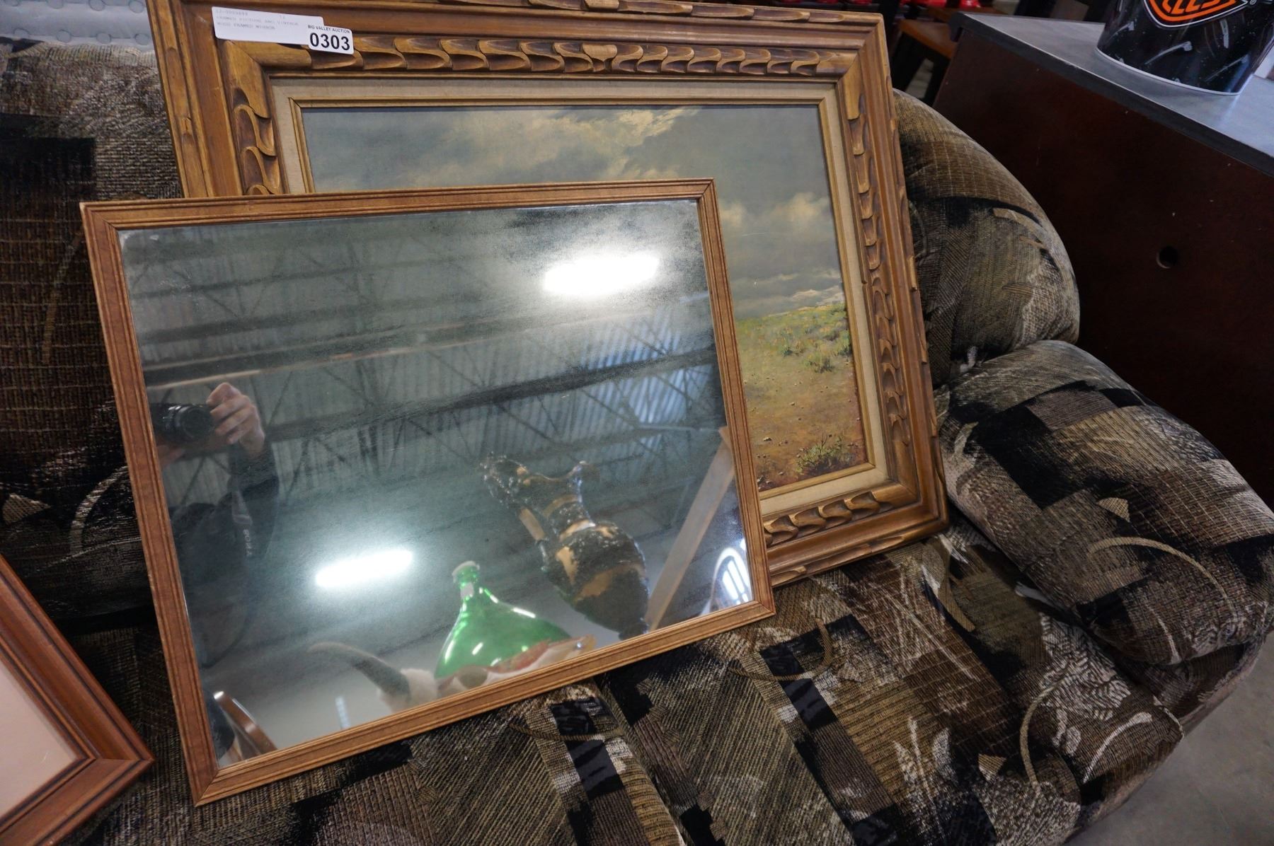 FRAMED PICTURE AND VINTAGE WOOD FRAMED MIRROR