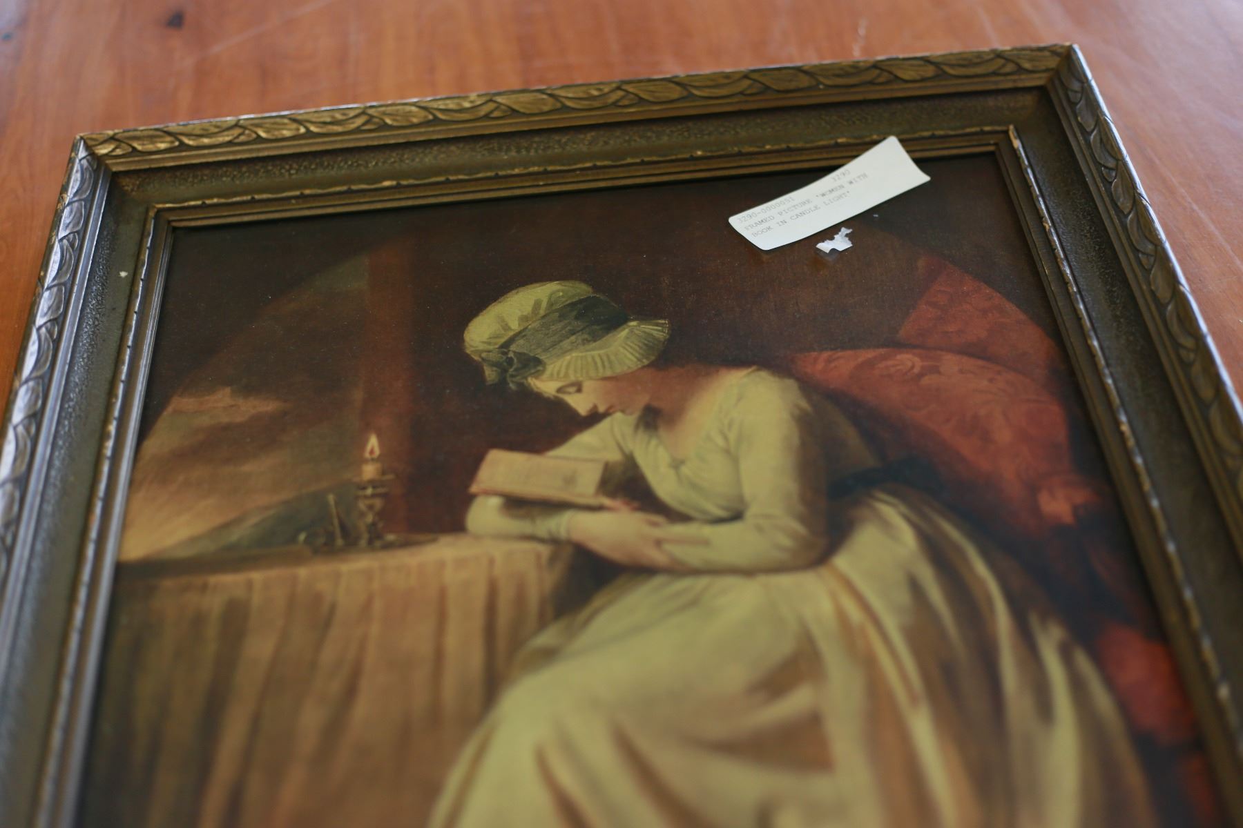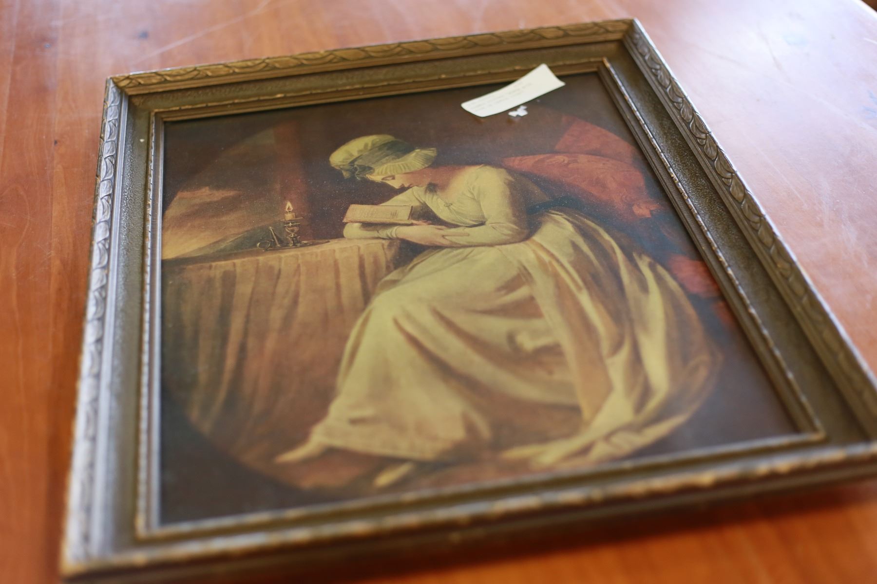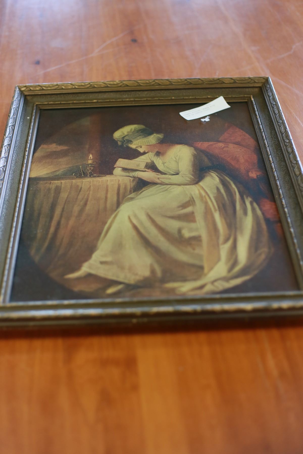 FRAMED PICTURE WOMEN WITH BOOK IN CANDLE LIGHT