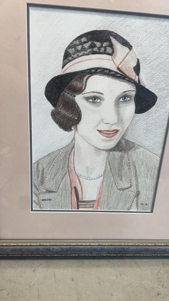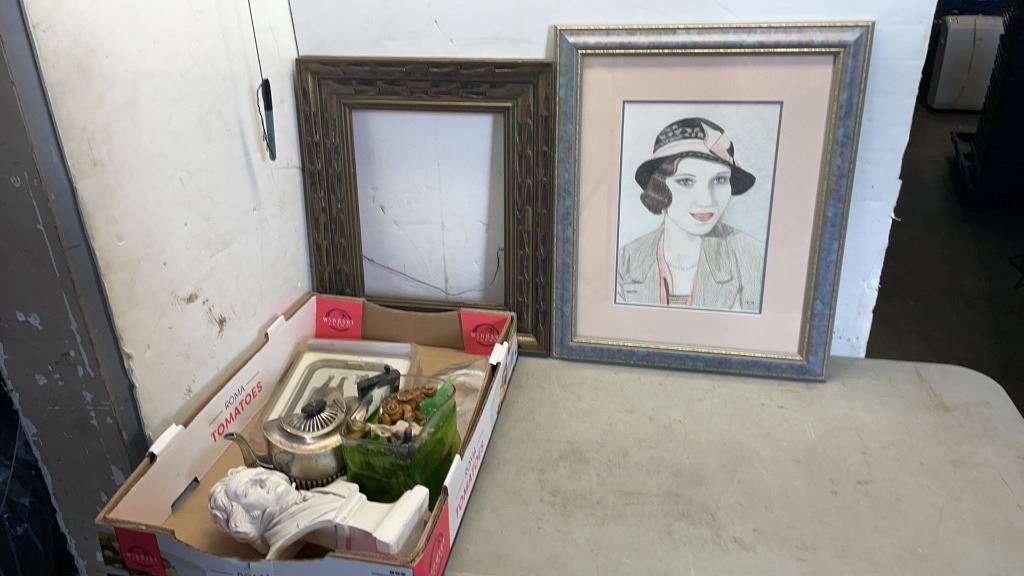 FRAMED SIGNED PORTRAIT WITH WOOD FRAME AND TRAY OF BEETHOVEN BUST , TEAPOT AND MORE