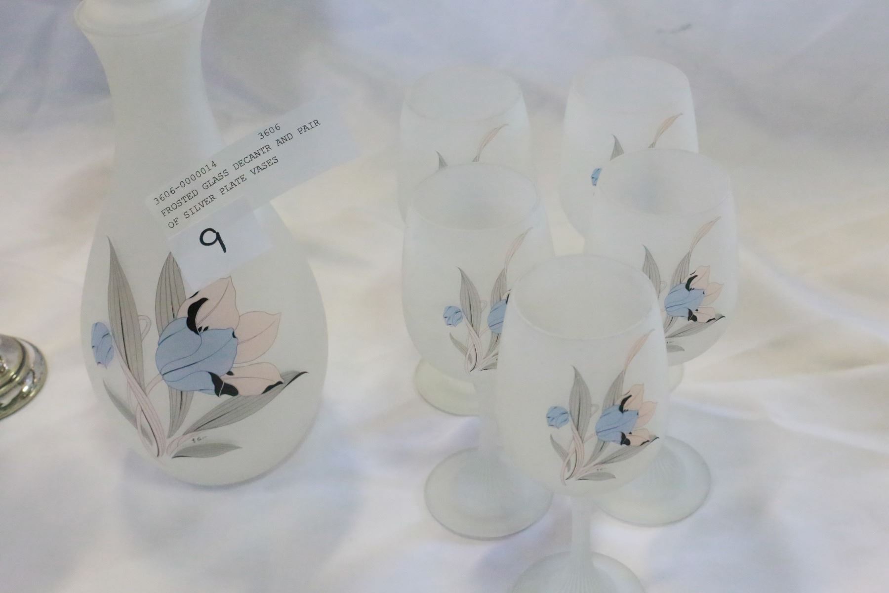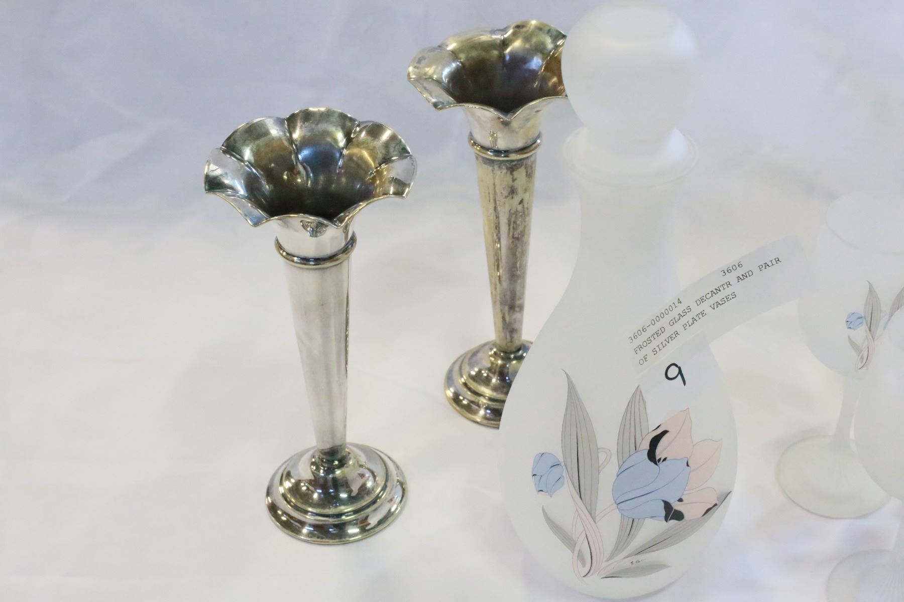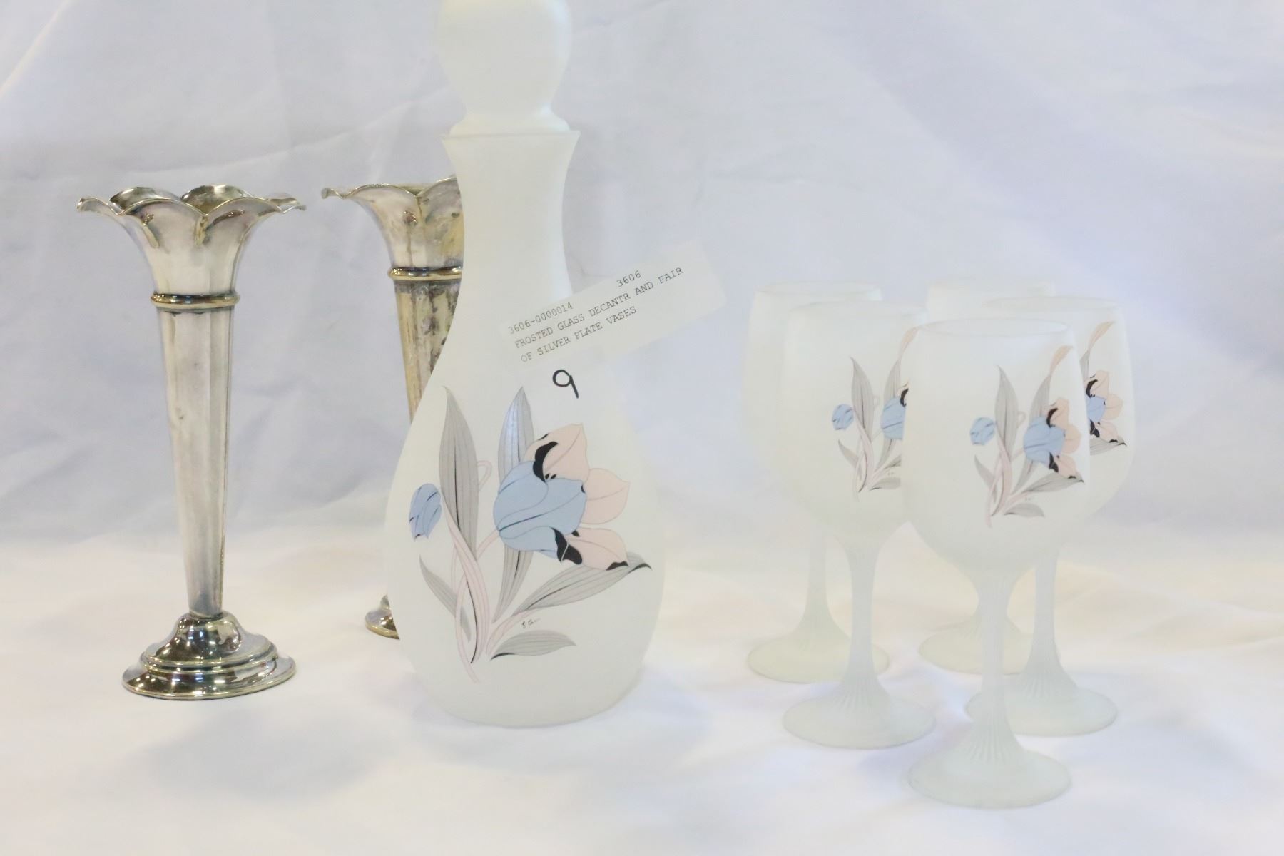 FROSTED GLASS DECANTR AND PAIR OF SILVER PLATE VASES