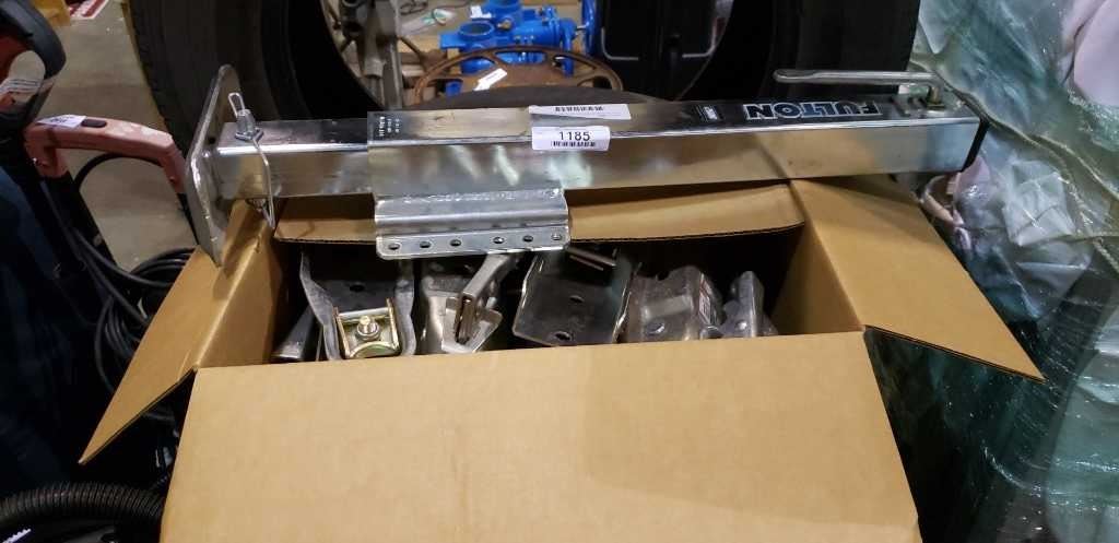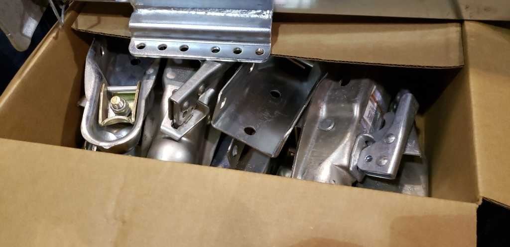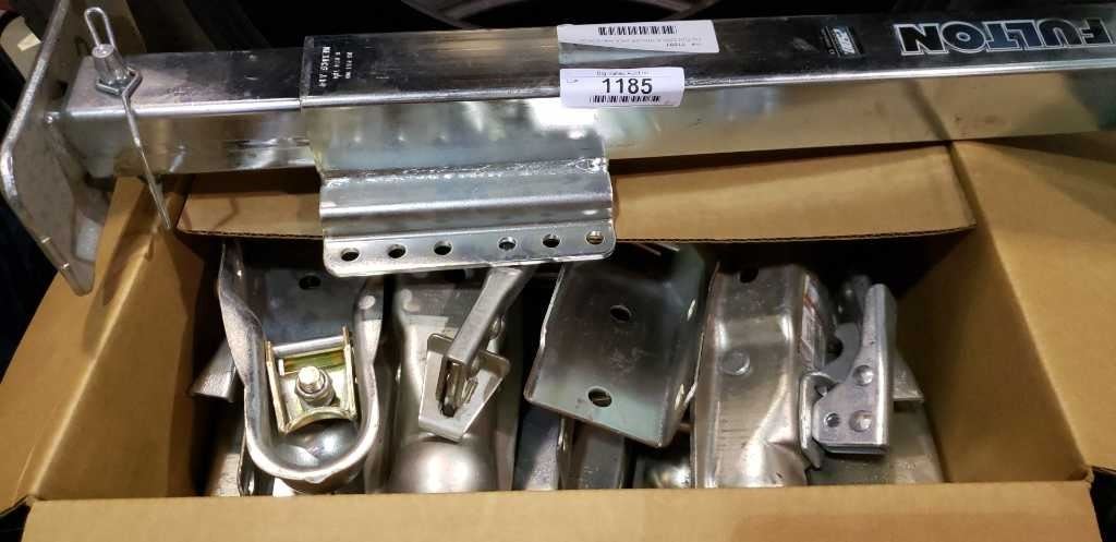 FULTON 2500LB TRAILER JACK AND BOX OF TRAILER COUPLERS