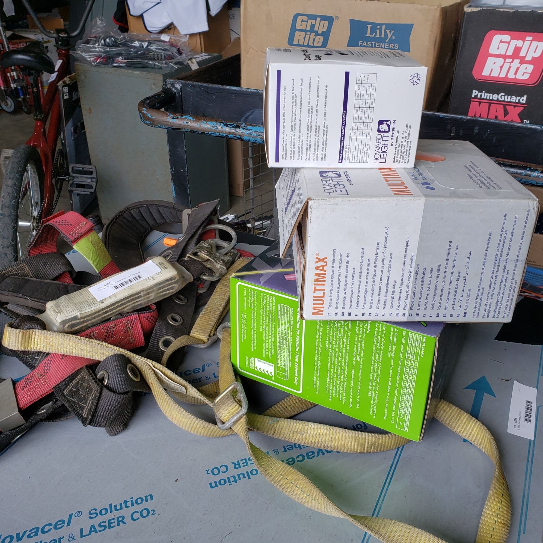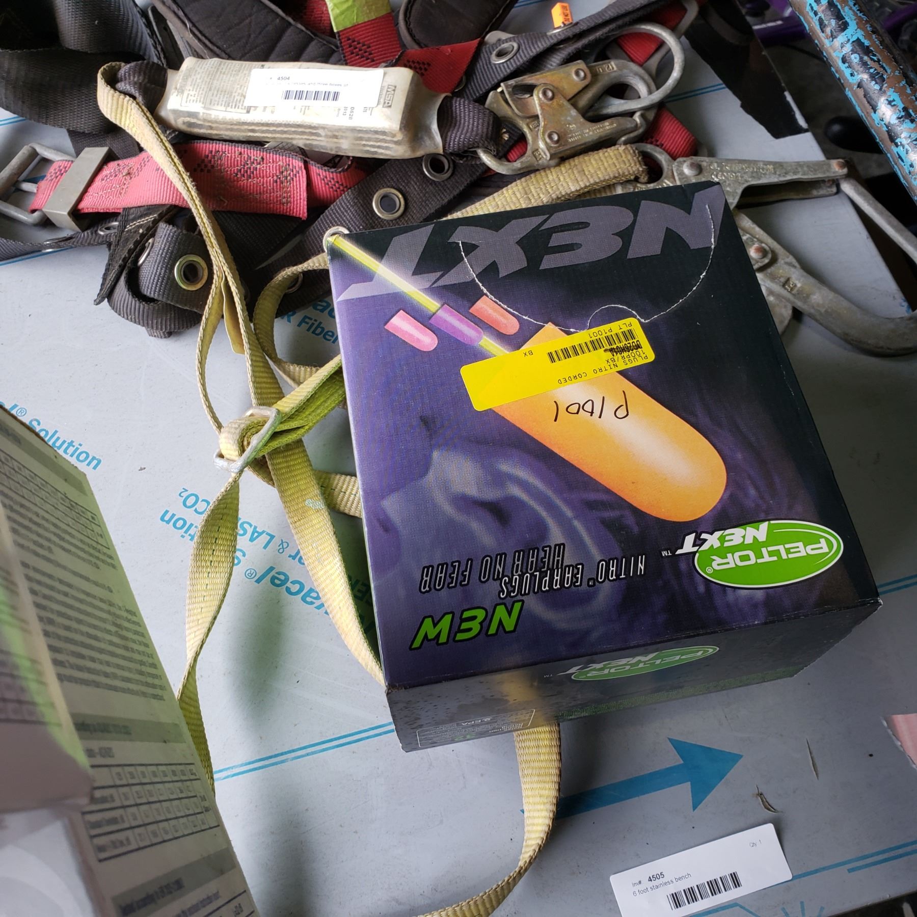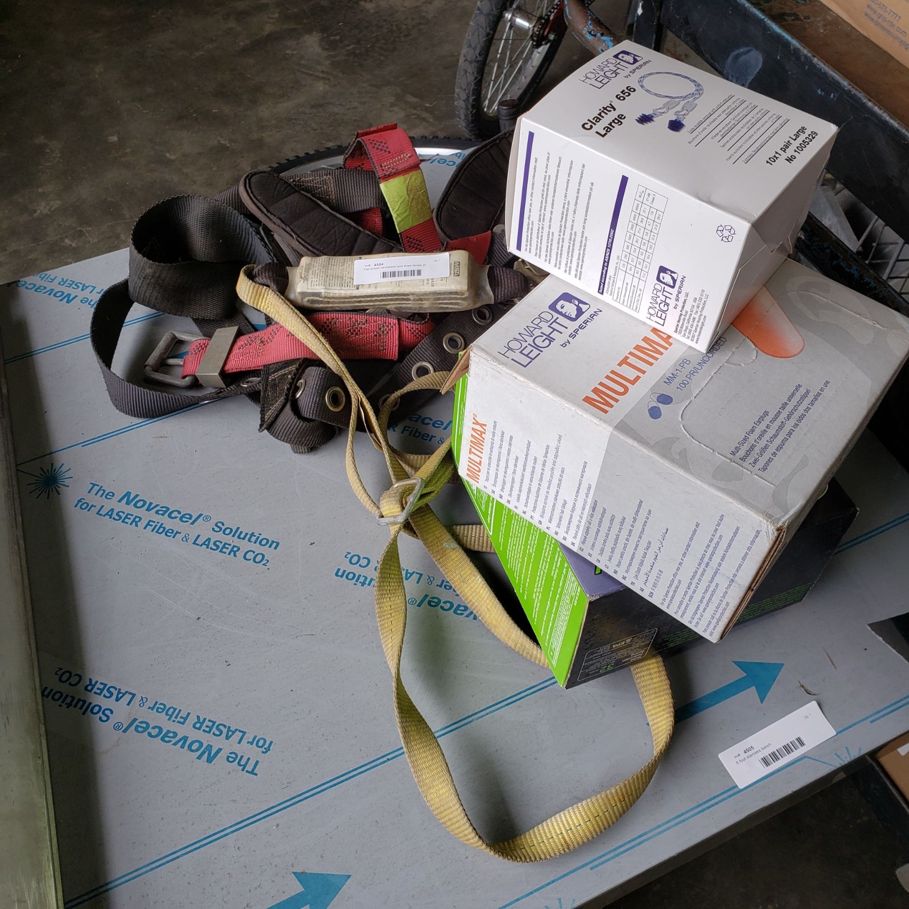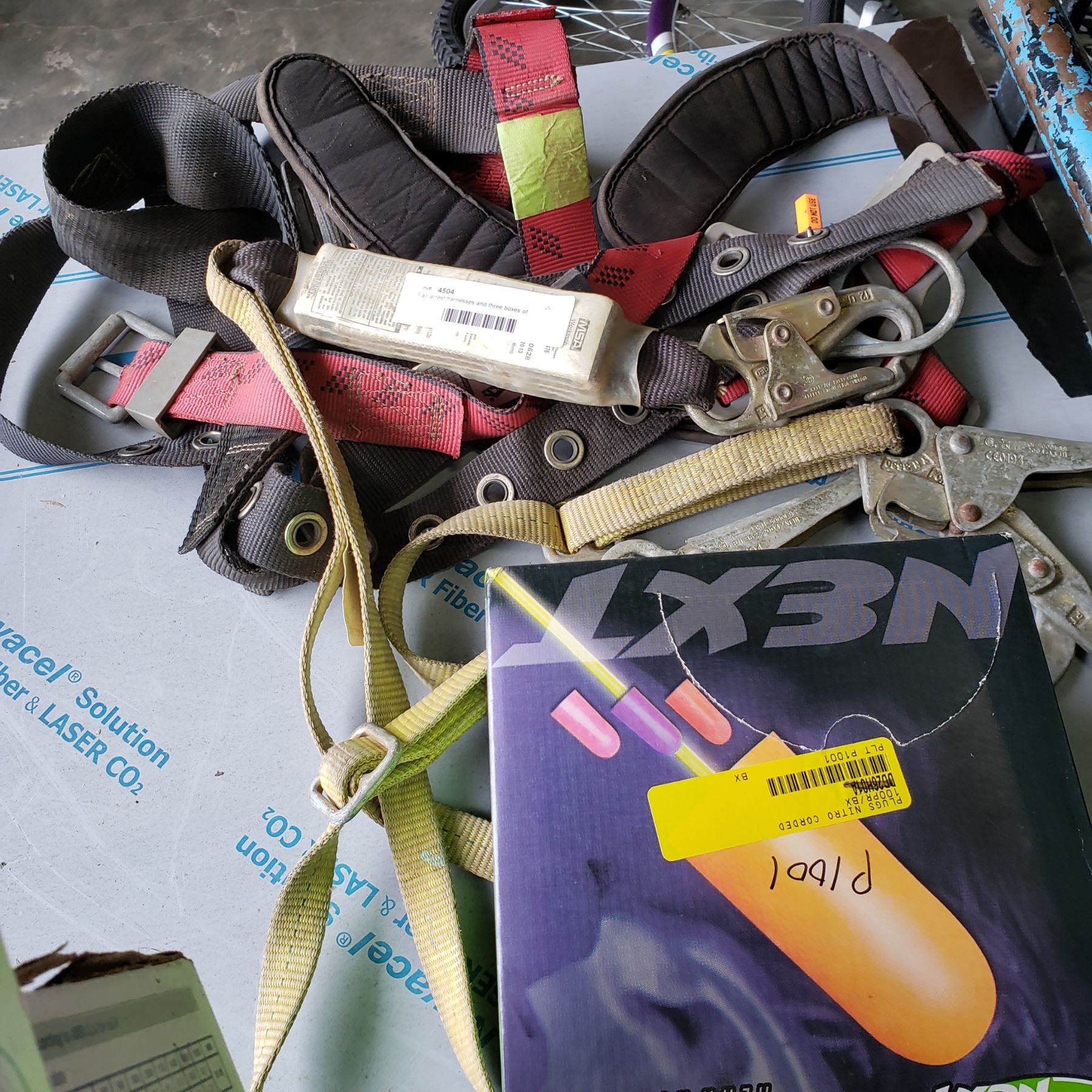Fall-arrest harnesses and three boxes of disposable ear plugs