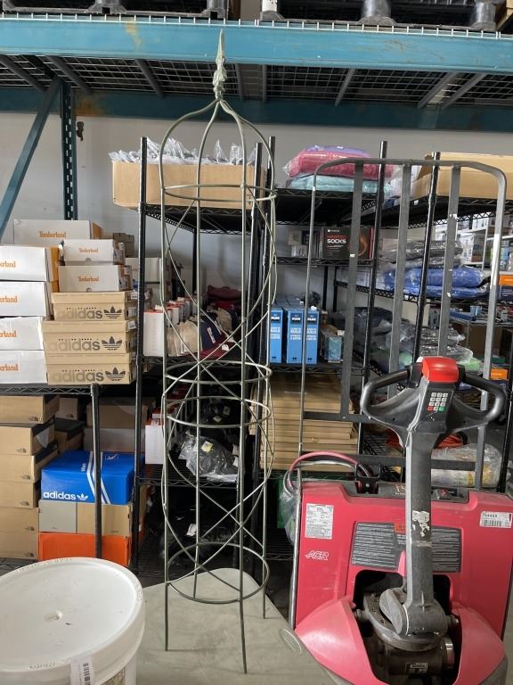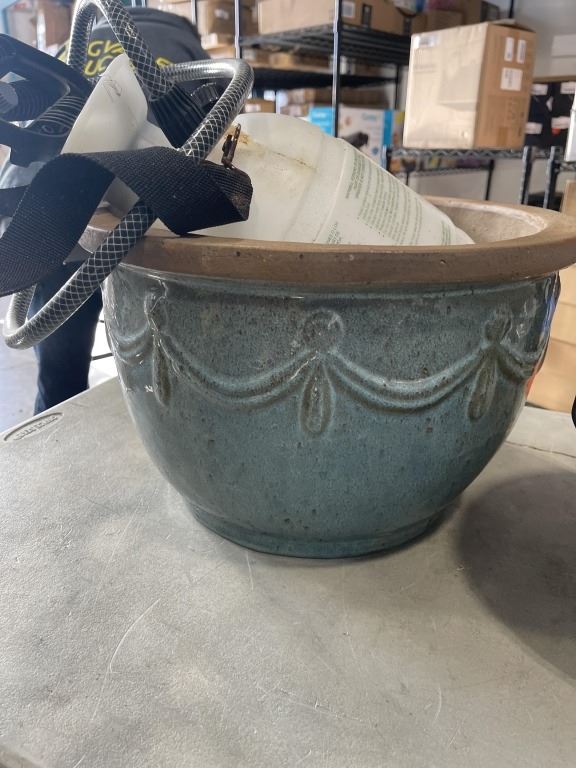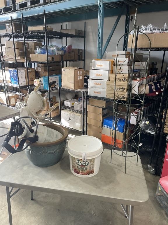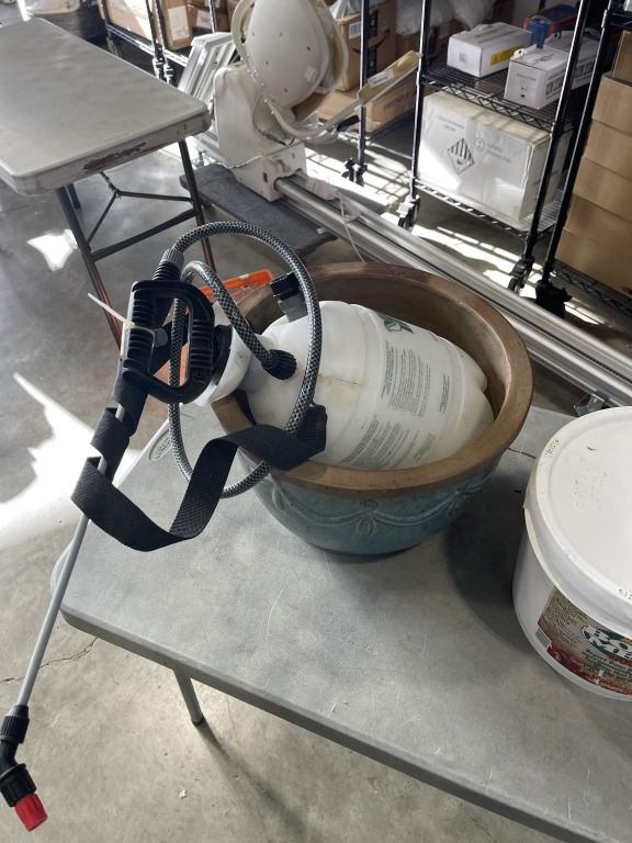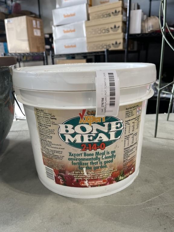 GARDEN PLANT POT, TOMATOE CAGE, SPRAYER AND BUCKET OF BONE MEAL