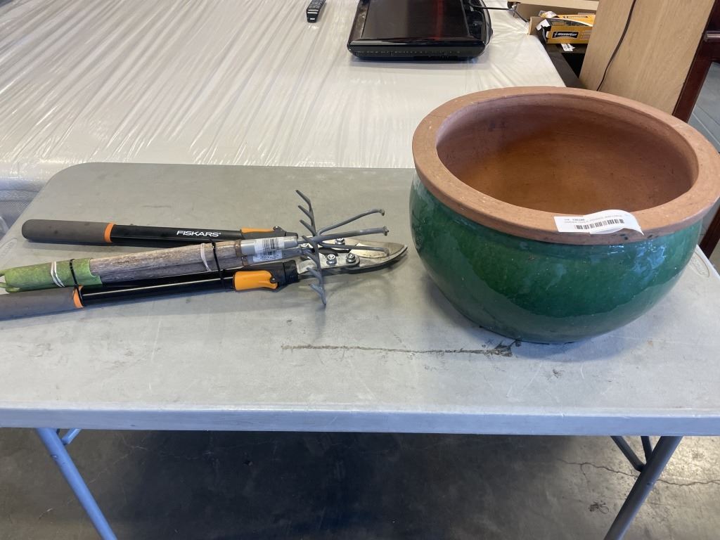GARDEN TOOLS, PRUNER, AND LARGE PLANTER POT