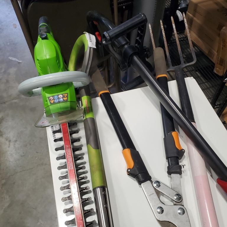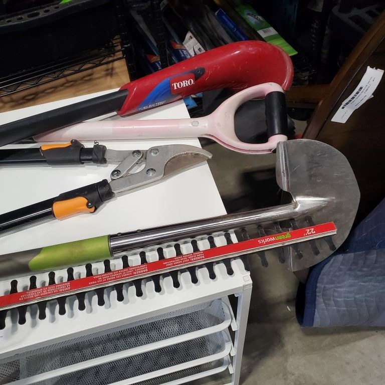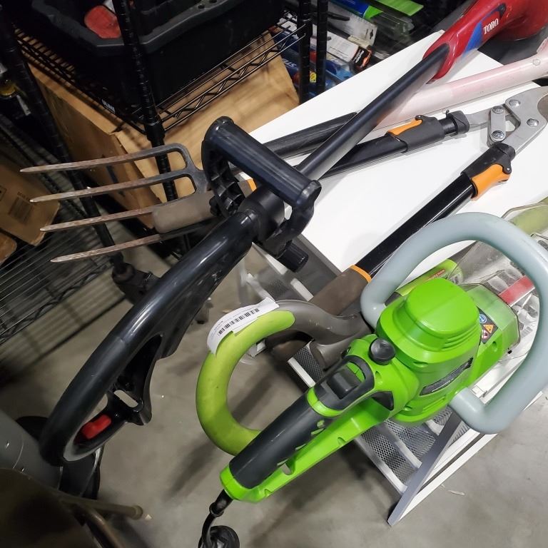 GARDENING TOOLS, WEED TRIMMER AND GREENWORKS ELECTRIC HEDGE TRIMMMER