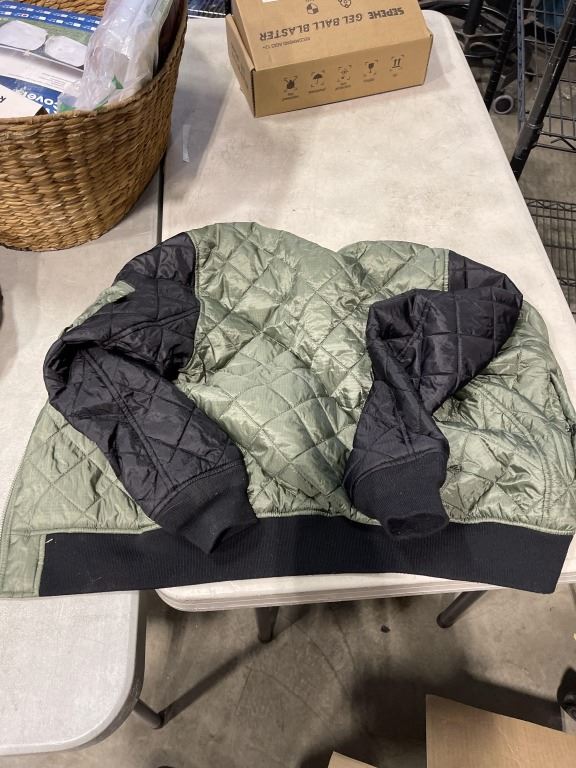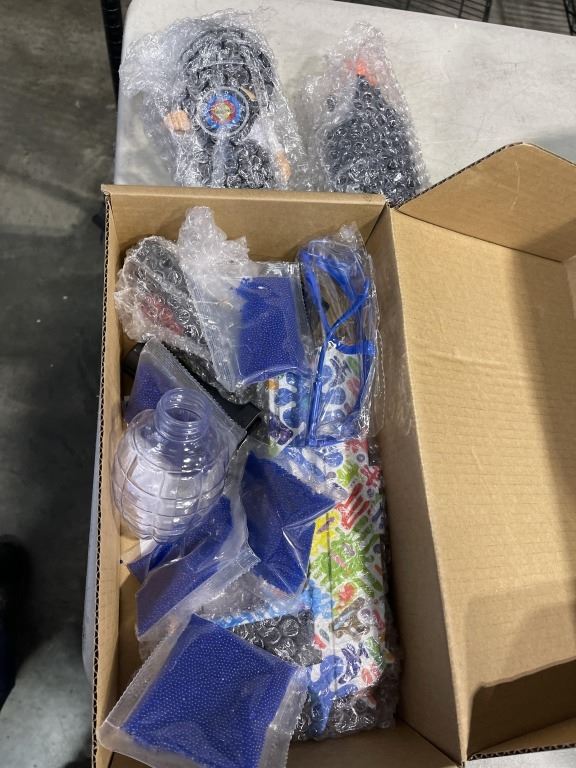 GELL BLASTER SET, SPACE SAVER BAGS, RV WHEEL COVERS, BASKET AND BOX OF ESTATE JACKETS BOOTS, BAGS ET