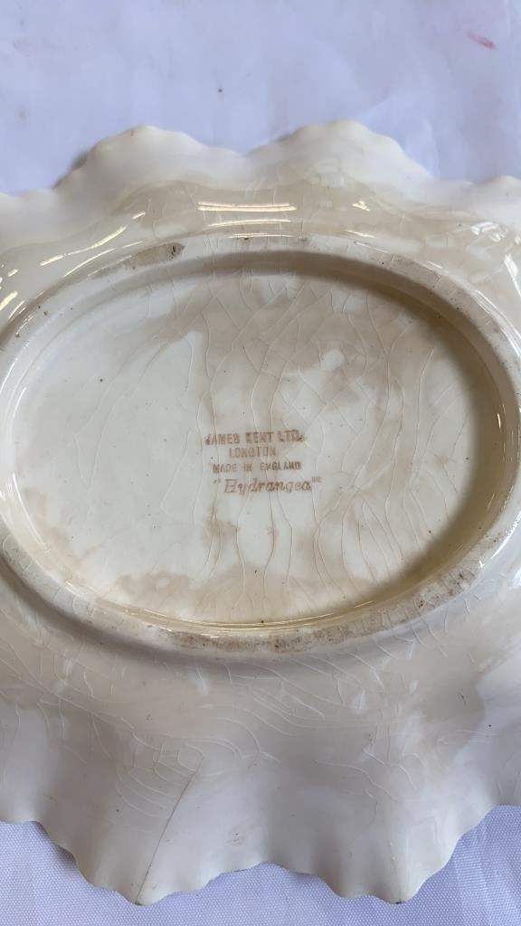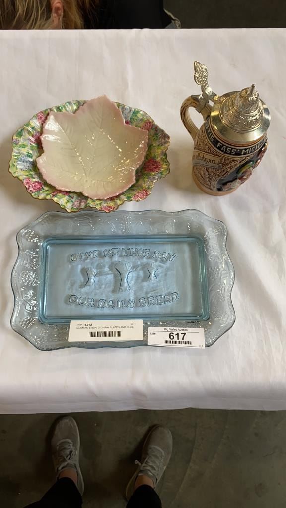 GERMAN STEIN, 2 CHINA PLATES AND BLUE GLASS PLATE