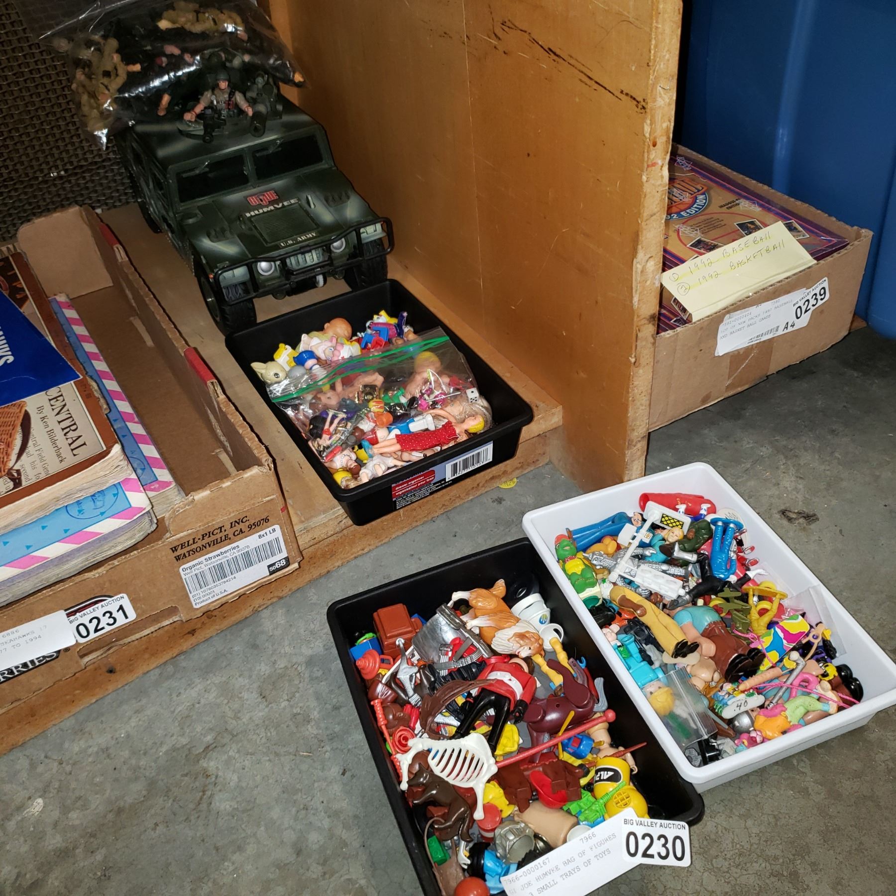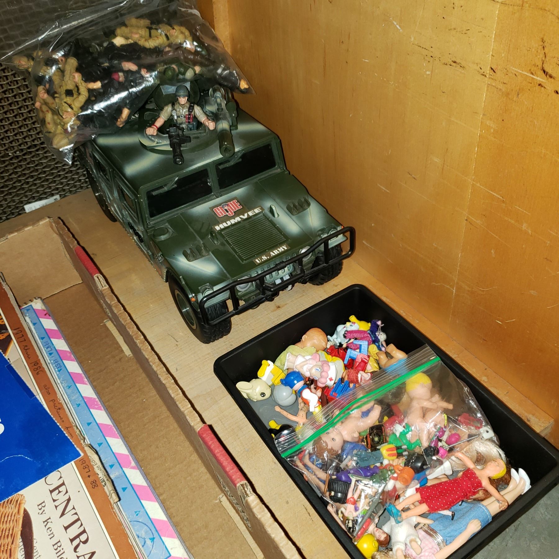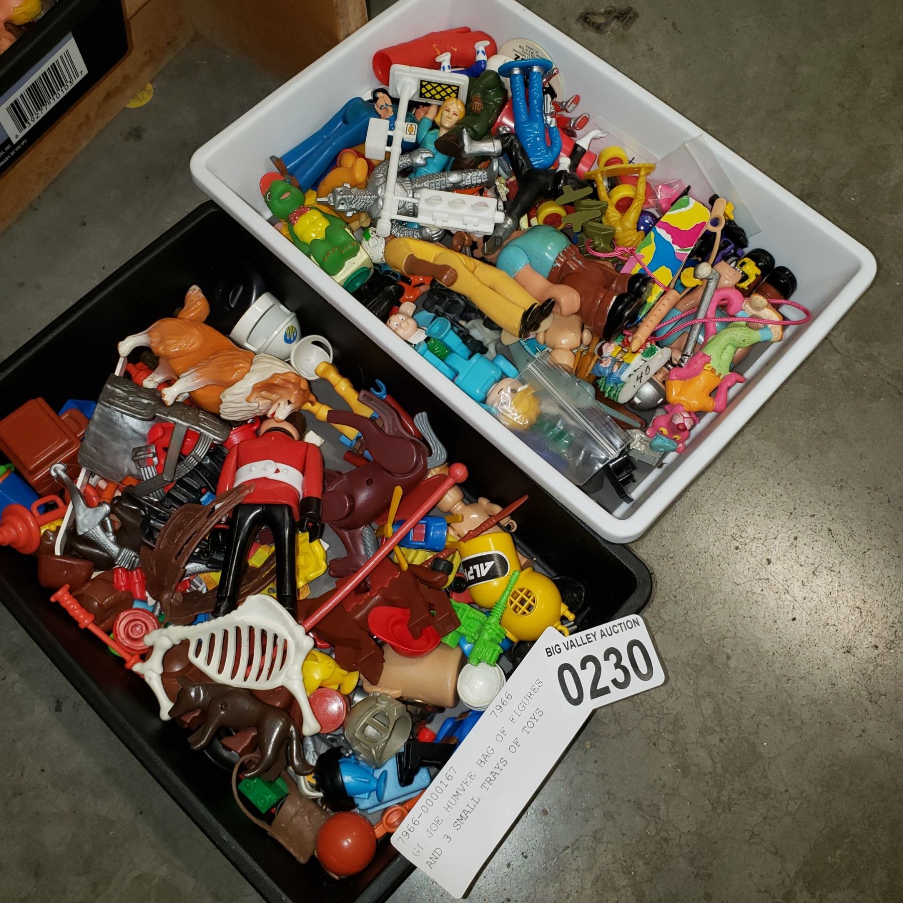 GI JOE HUMVEE BAG OF FIGURES AND 3 SMALL TRAYS OF TOYS
