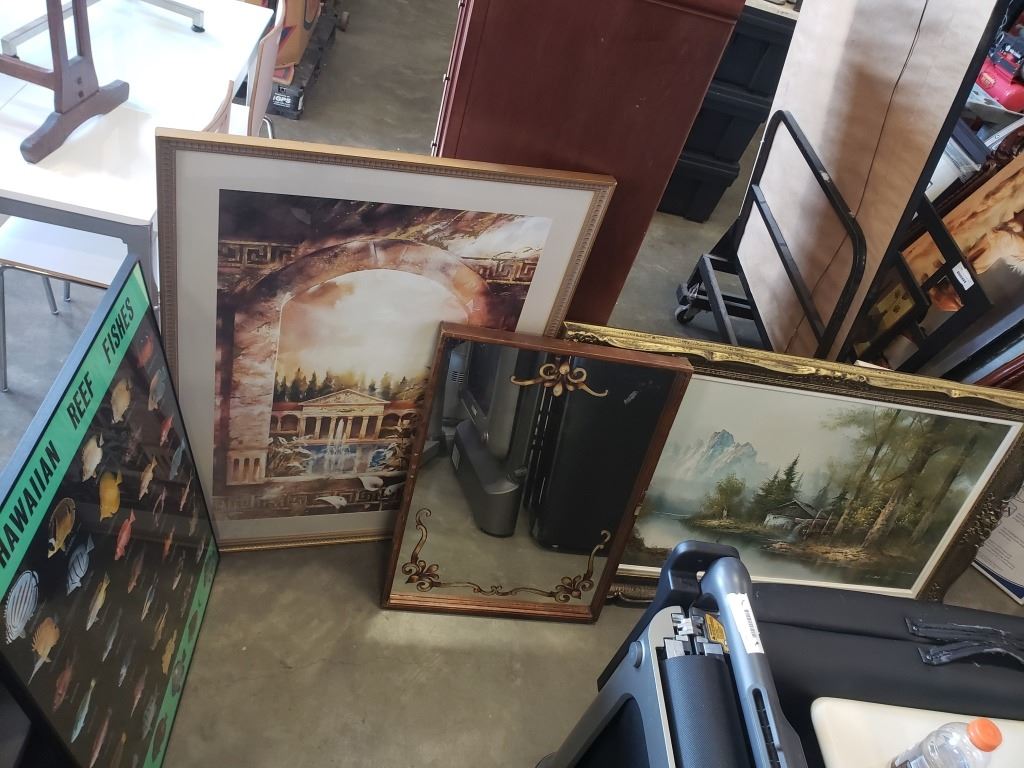 GILT FRAMED PAINTING, 2 FRAMED PRINTS AND MIRROR