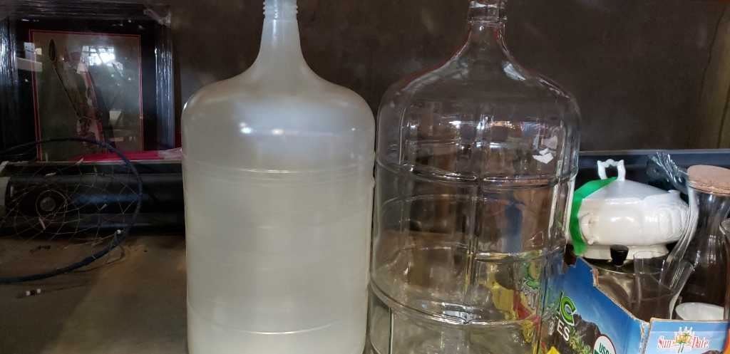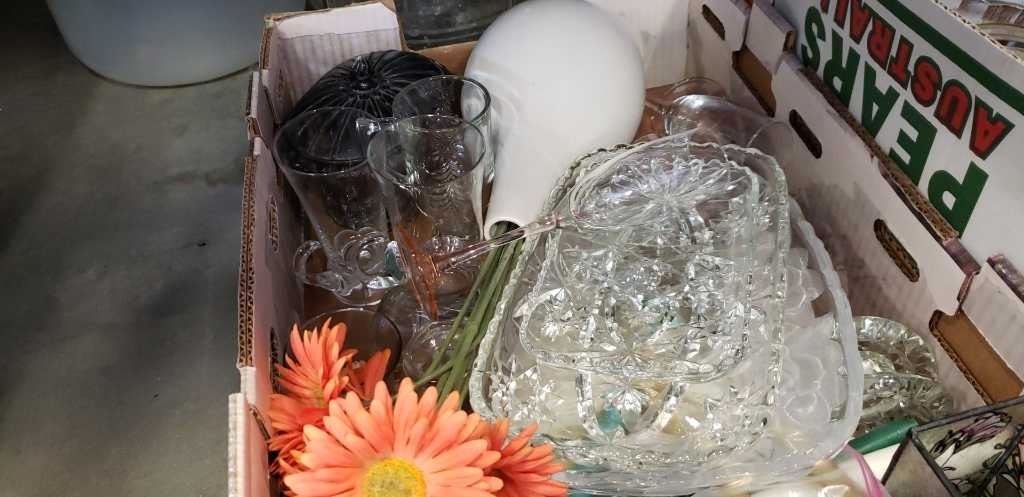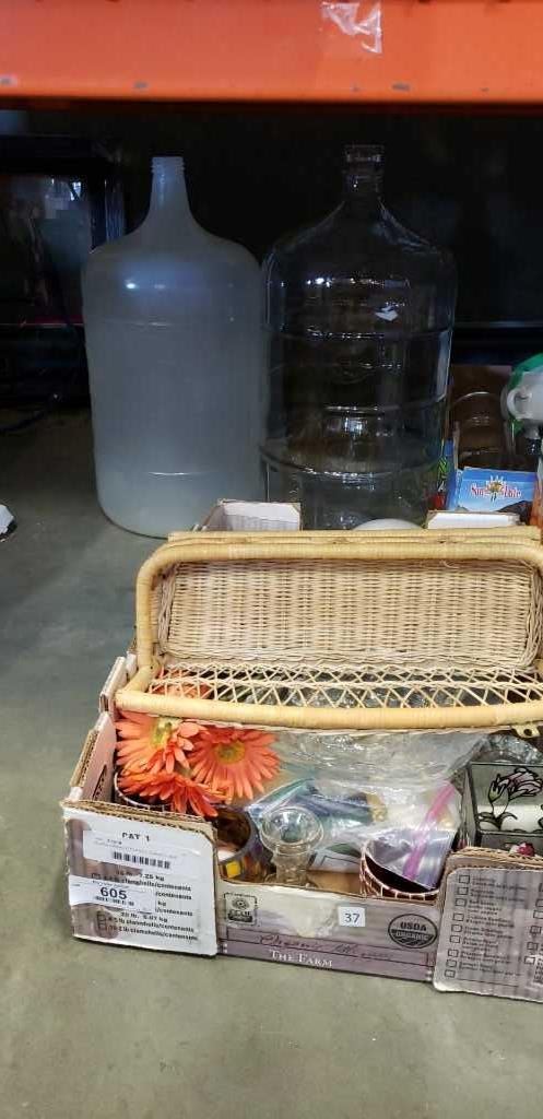 GLASS CARBOY, PLASTIC CARBOY AND TRAY OF VASES AND SERVING PIECES
