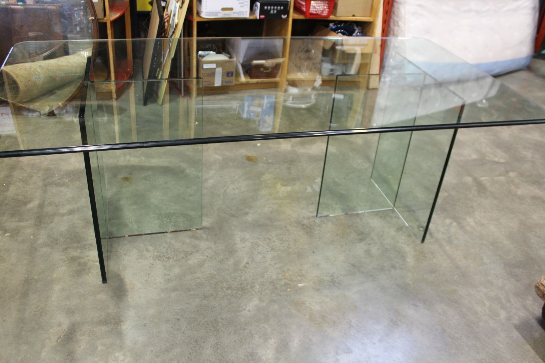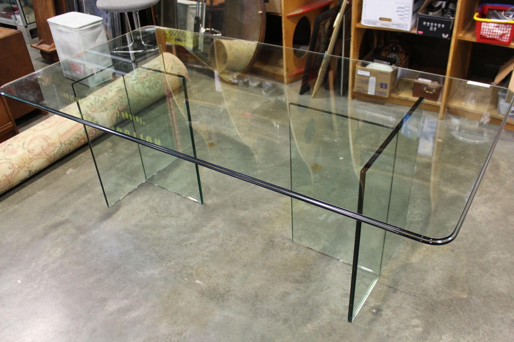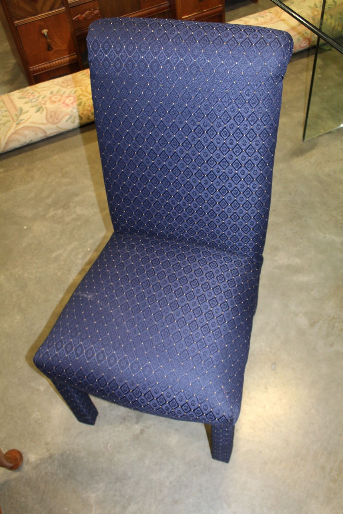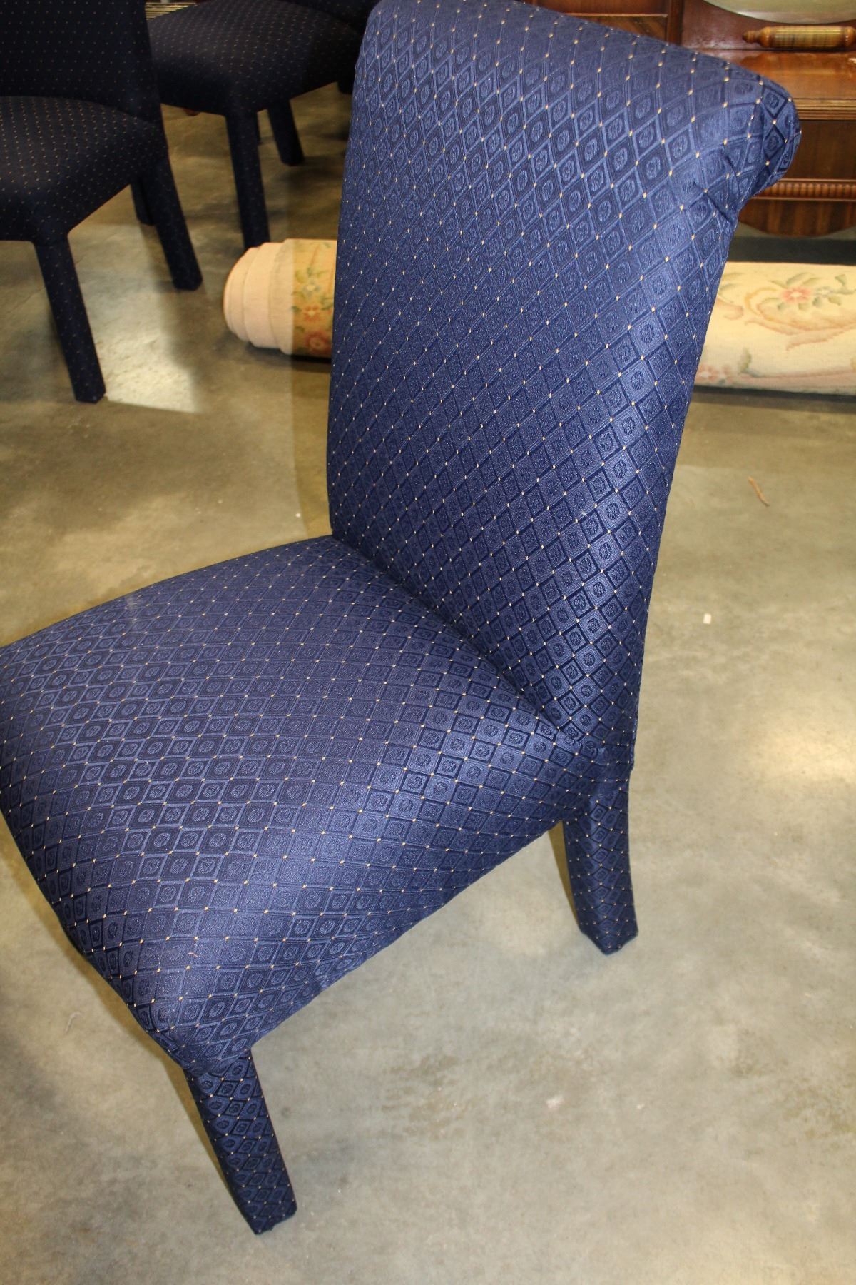 GLASS DINING TABLE WITH 8 BLUE UPHOLSTERED CHAIRS