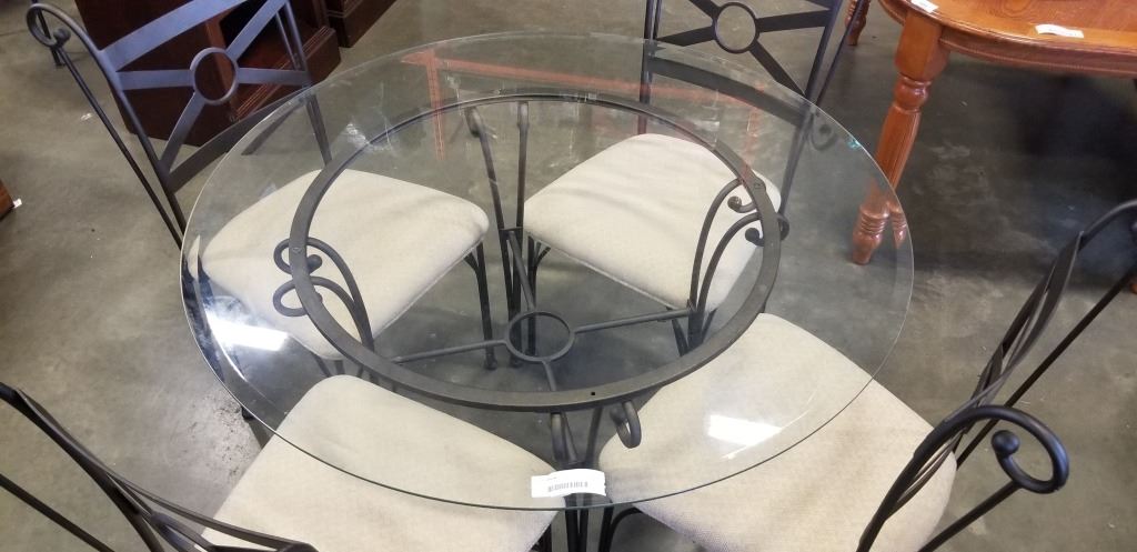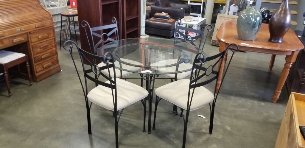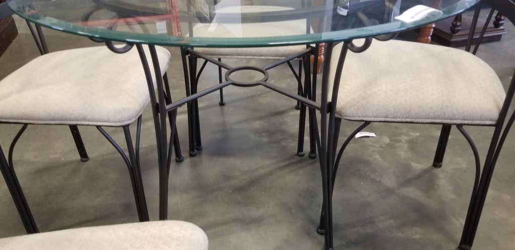 GLASS TOP METAL BASE DINING TABLE W/ 4 CHAIRS