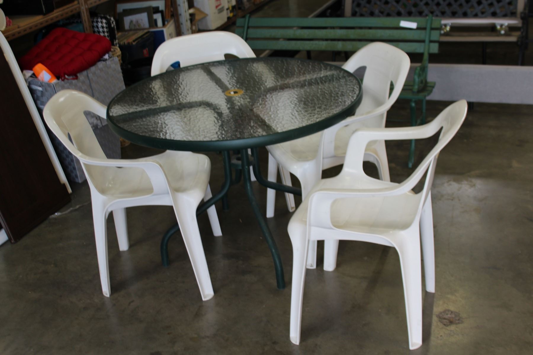 GLASS TOP PATIO TABLE AND 4 CHAIRS