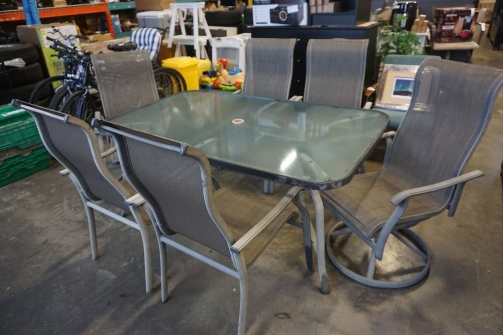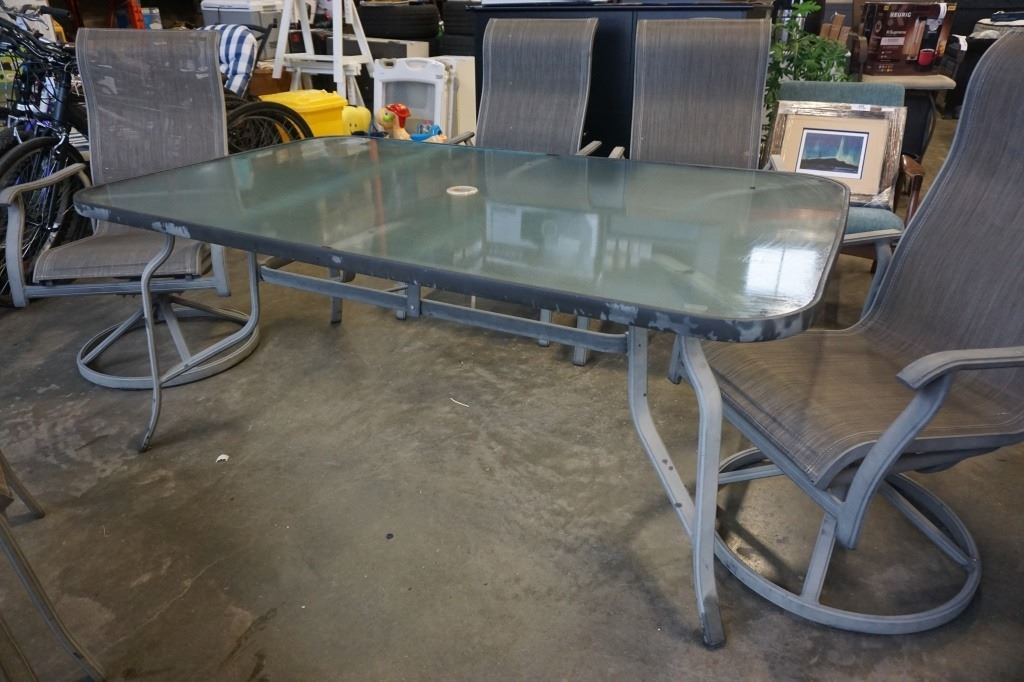 GLASS TOP PATIO TABLE W/ 6 METAL FRAME MESH PATIO CHAIRS - 2 SWIVEL