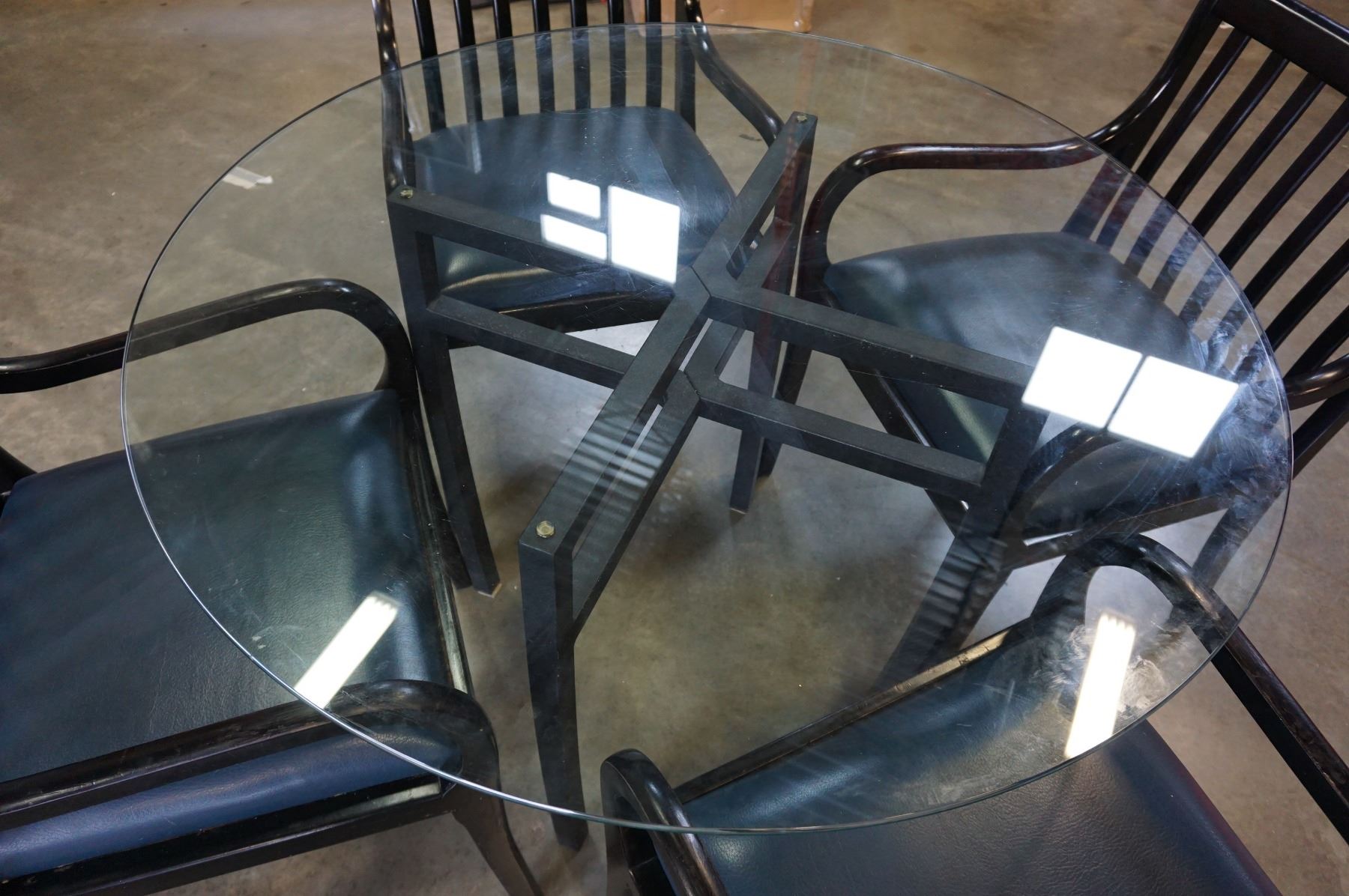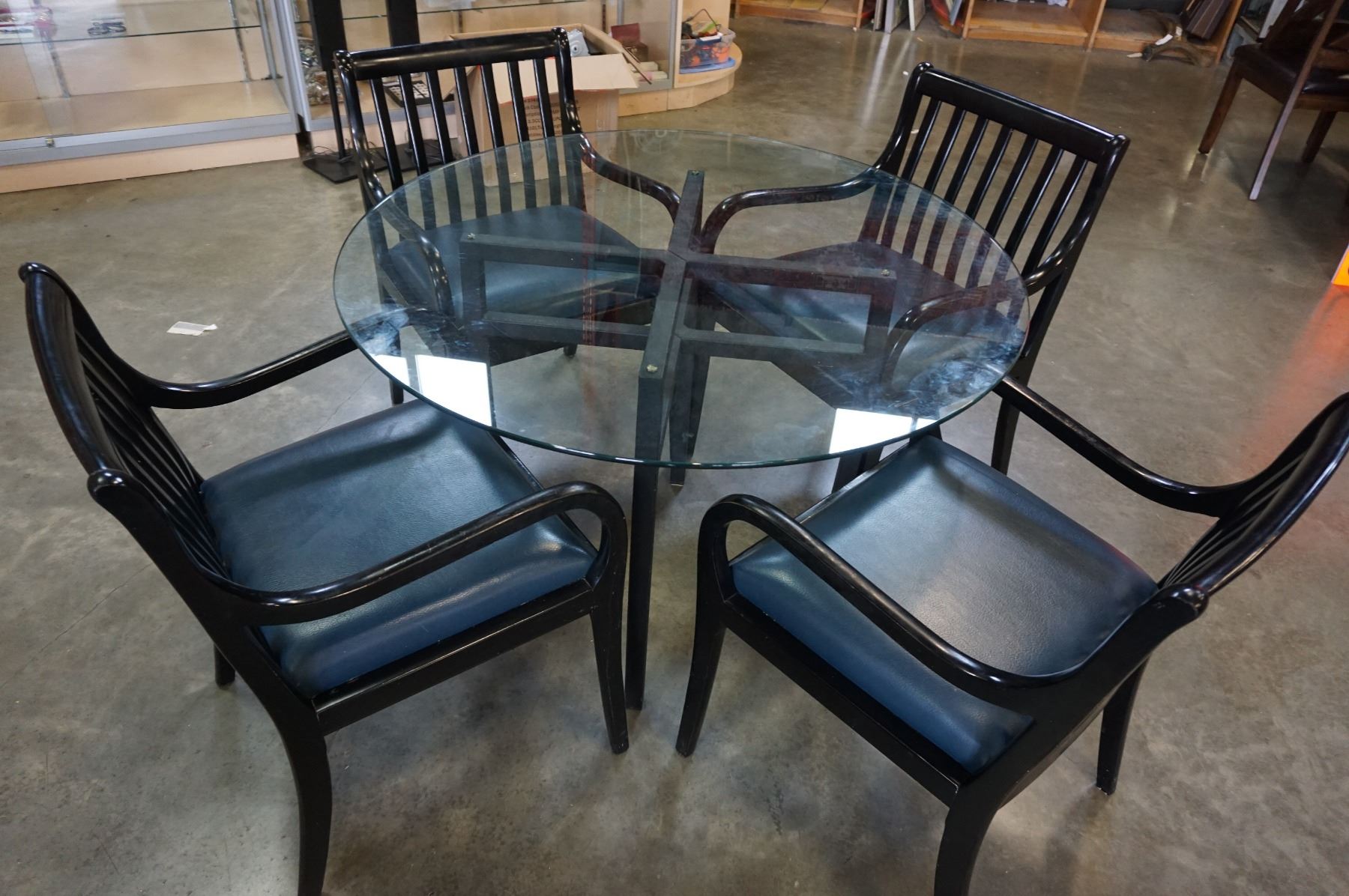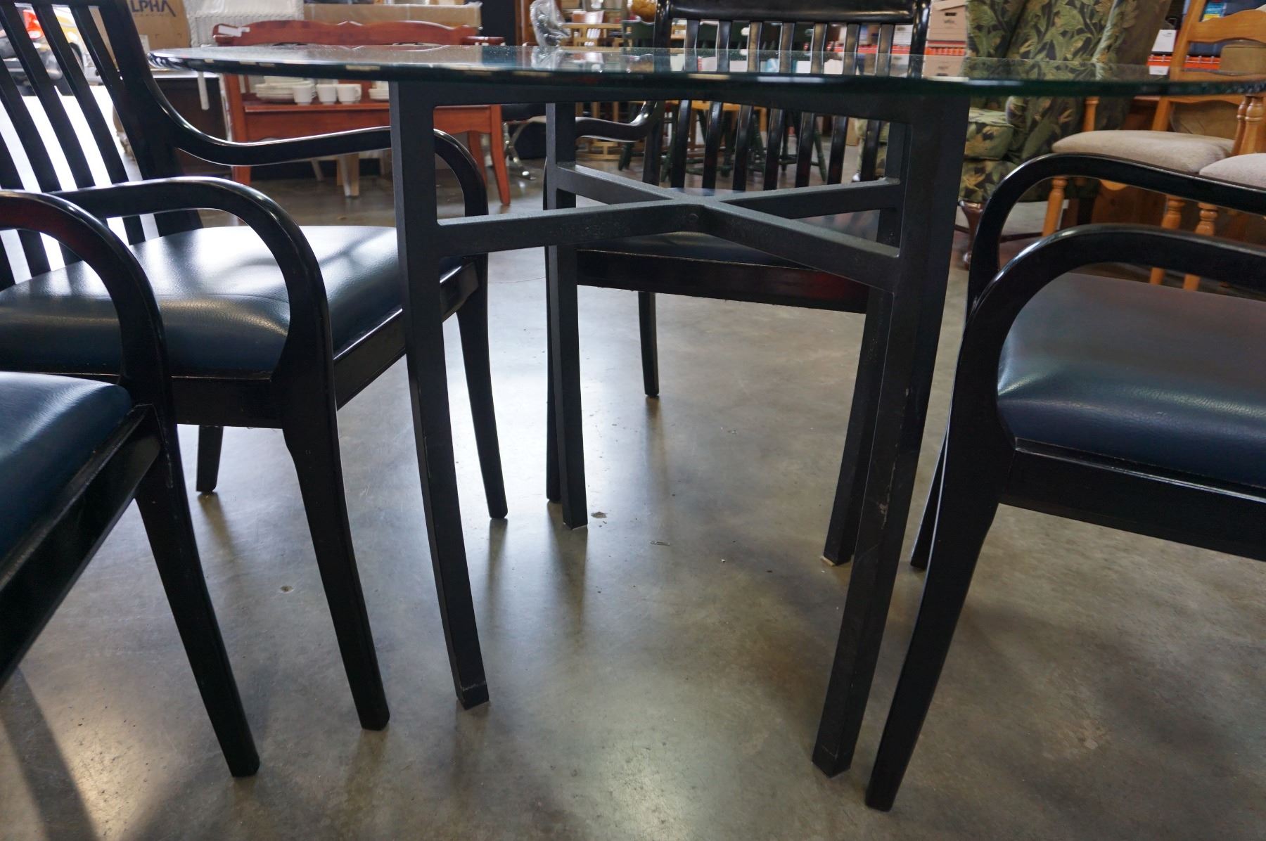 GLASS TOP TABLE AND 4 CHAIRS W/ LEATHER CUSHIONS