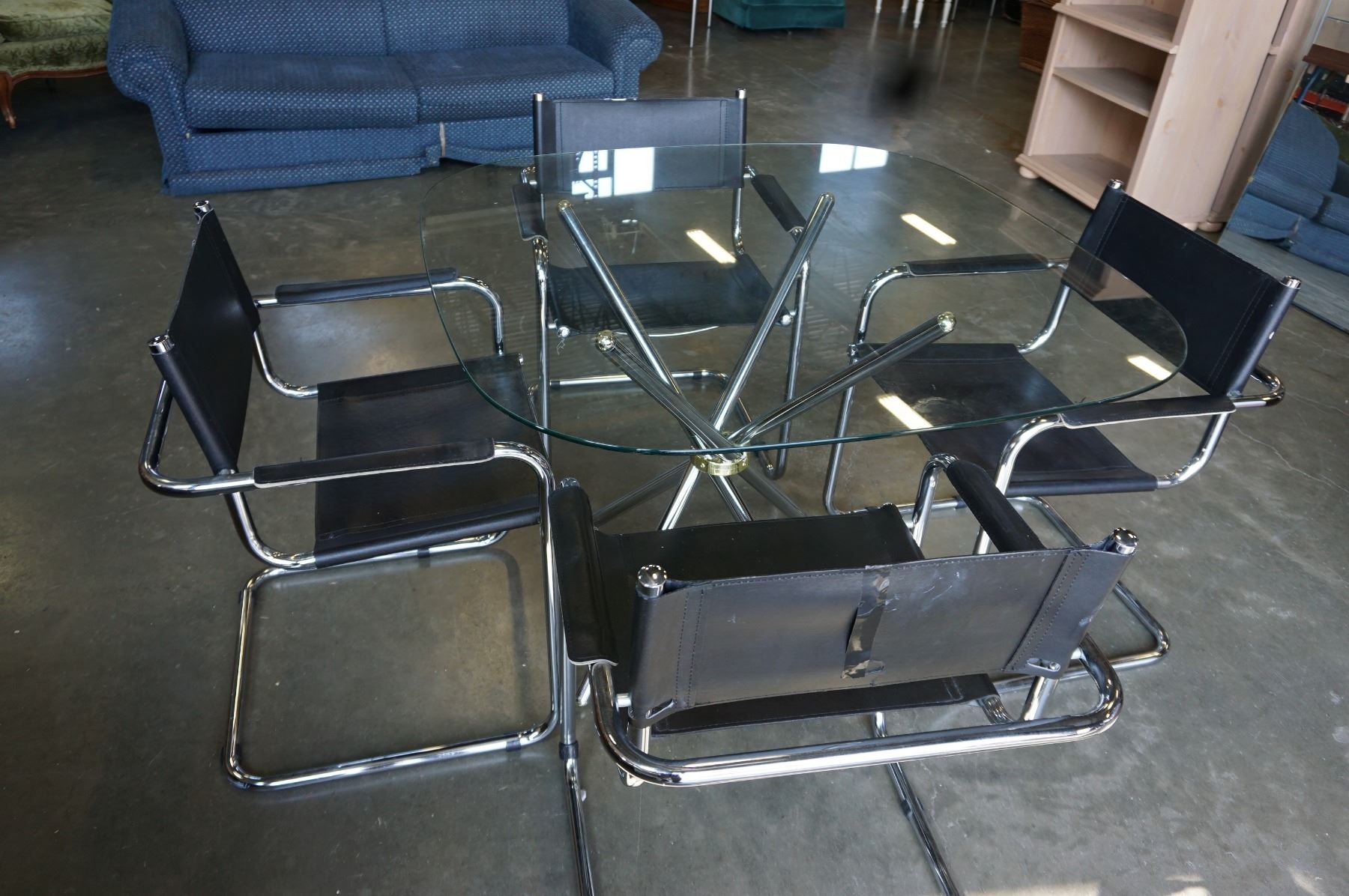GLASSTOP CHROME BASE DINING TABLE WITH 4 LEATHER SLING CHAIRS