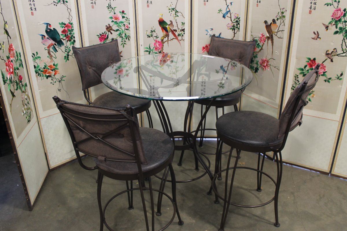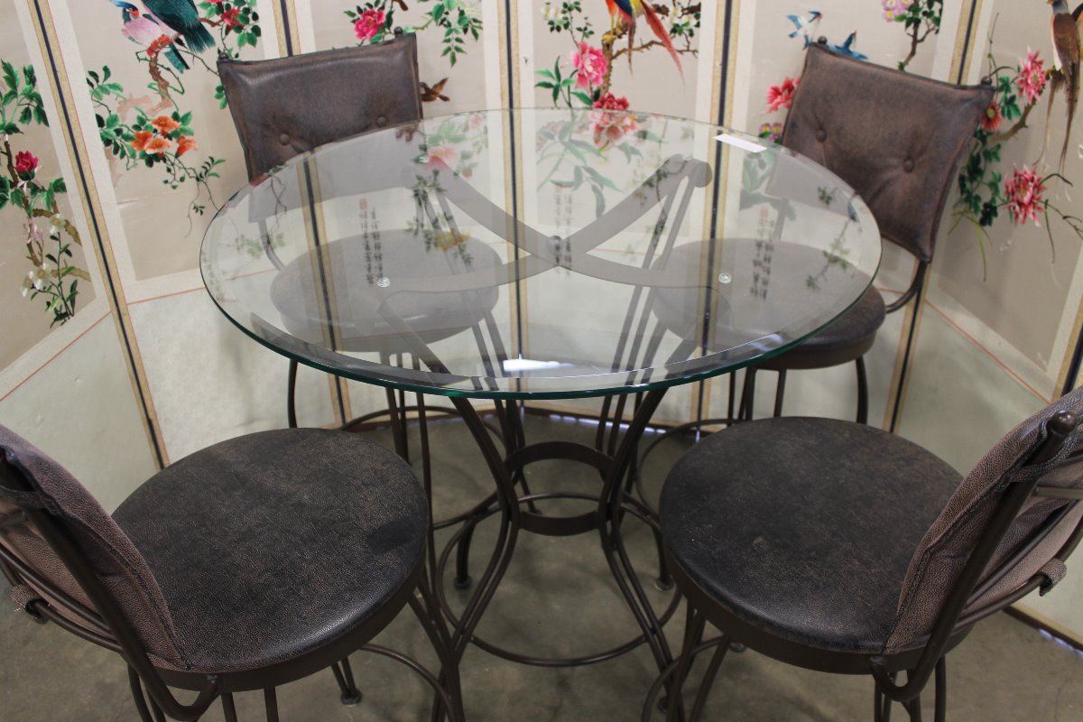 GLASSTOP METAL BISTRO TABLE AND 4 BARSTOOLS