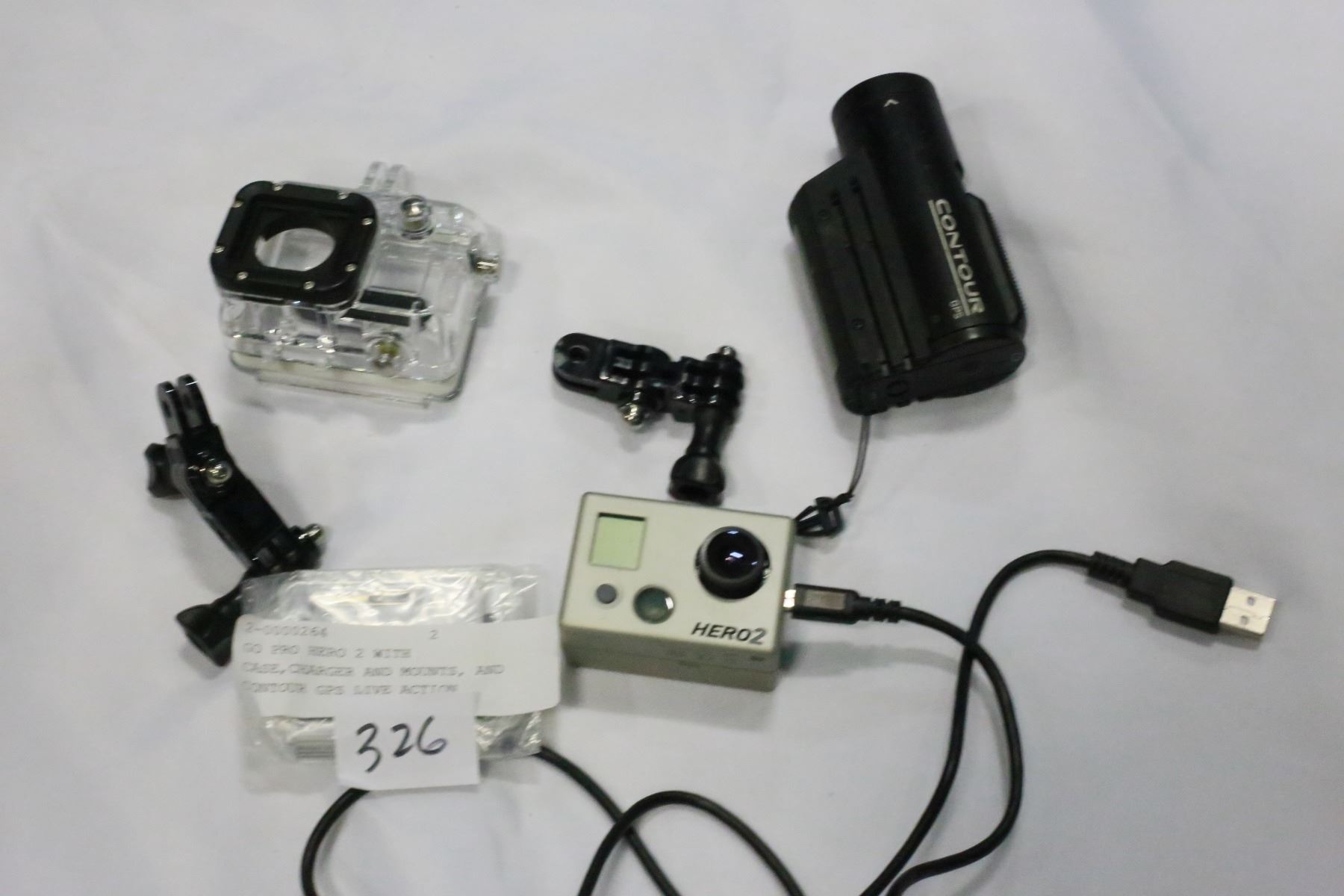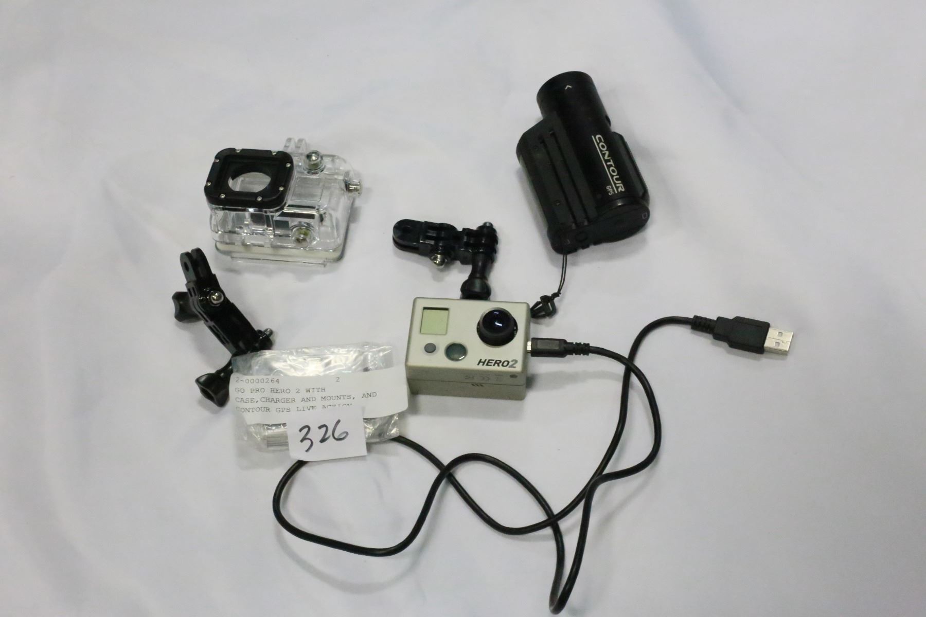 GO PRO HERO 2 WITH CASE,CHARGER AND MOUNTS, AND CONTOUR GPS LIVE ACTION CAMERA, CONDITION UNKNOWN