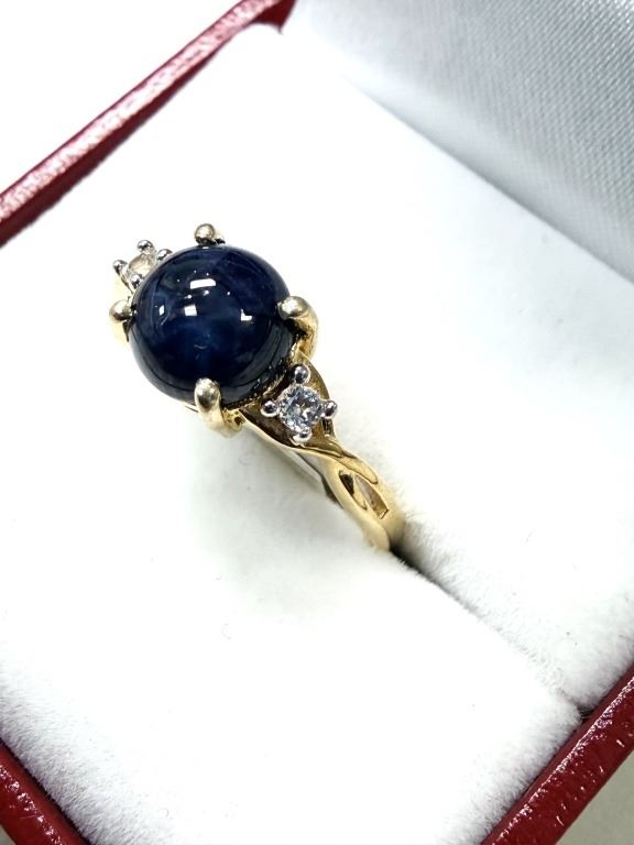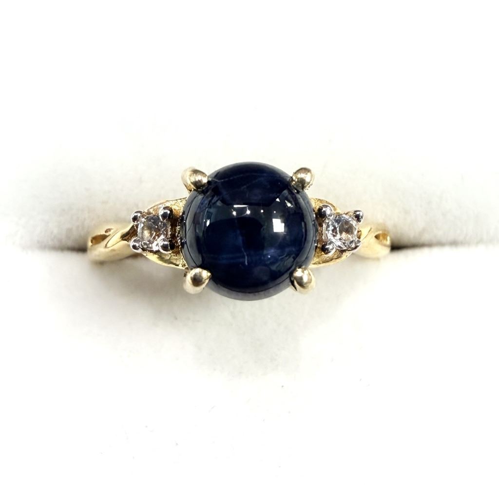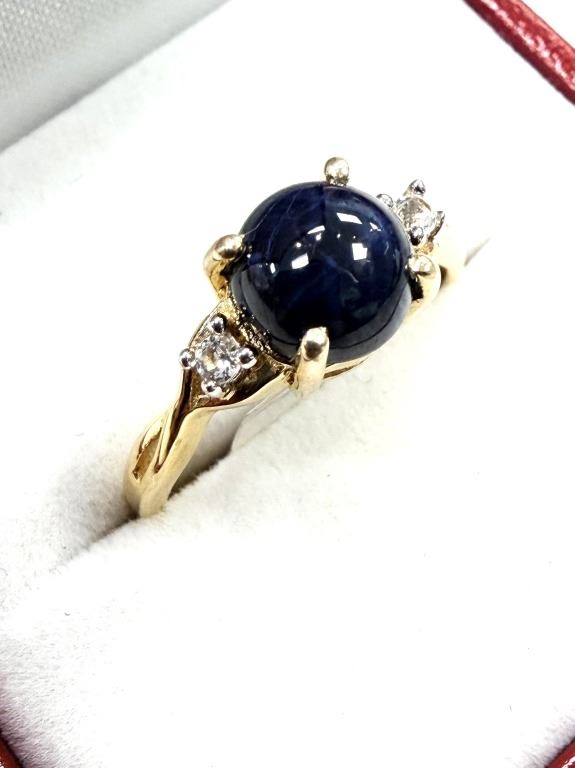 GOLD PLATED STERLING SILVER NATURAL BLUE SAPPHIRE (1.35CT) AND NATURAL WHITE TOPAZ (0.07CT) RING, SIZE 5.5, W/A $540.00. SAPPHIRE IS THE BIRTHSTONE FOR SEPTEMBER.