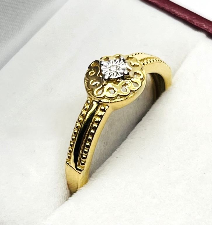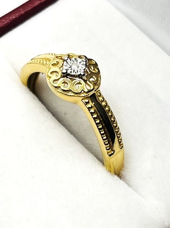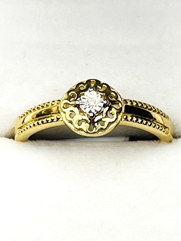 GOLD PLATED STERLING SILVER NATURAL DIAMOND (0.01CT) RING, SIZE 8, W/A $300.00.