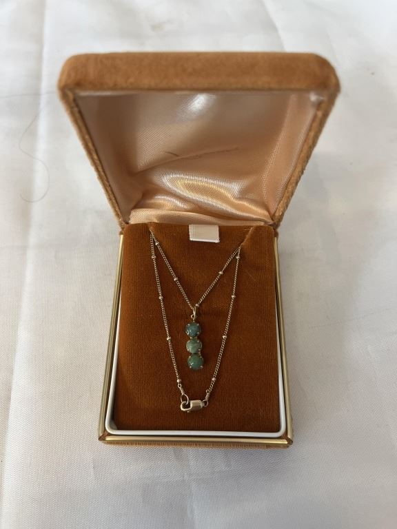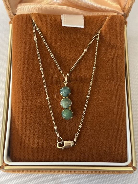 GOLD W/ 3 GREEN JADE STONES PENDANT NECKLACE, CLASP MARKED GF