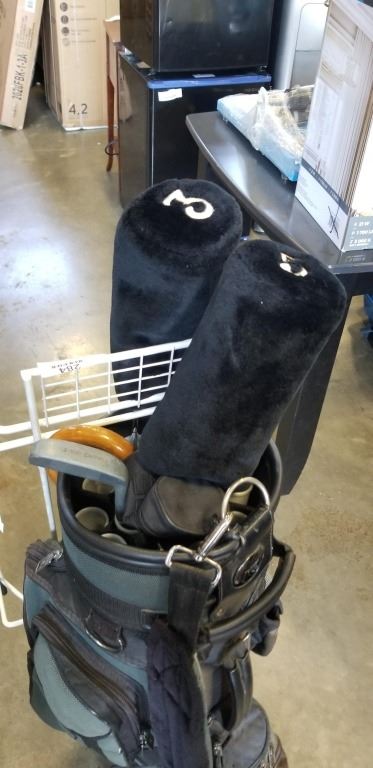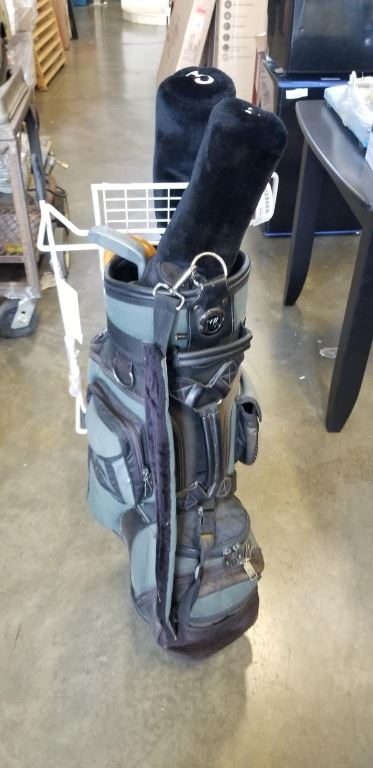 GOLF BAG WITH A FEW CLUBS AND 2-WAY CHIPPER AND BIKE RACK WALL HANGER