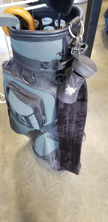 GOLF BAG WITH A FEW CLUBS AND 2-WAY CHIPPER AND BIKE RACK WALL HANGER