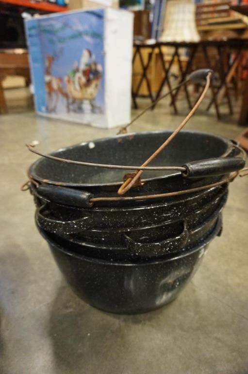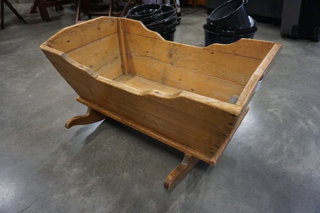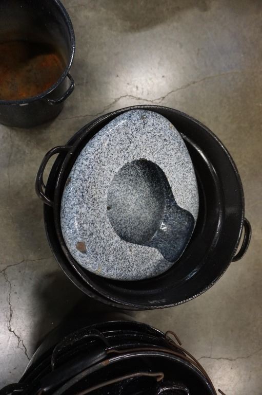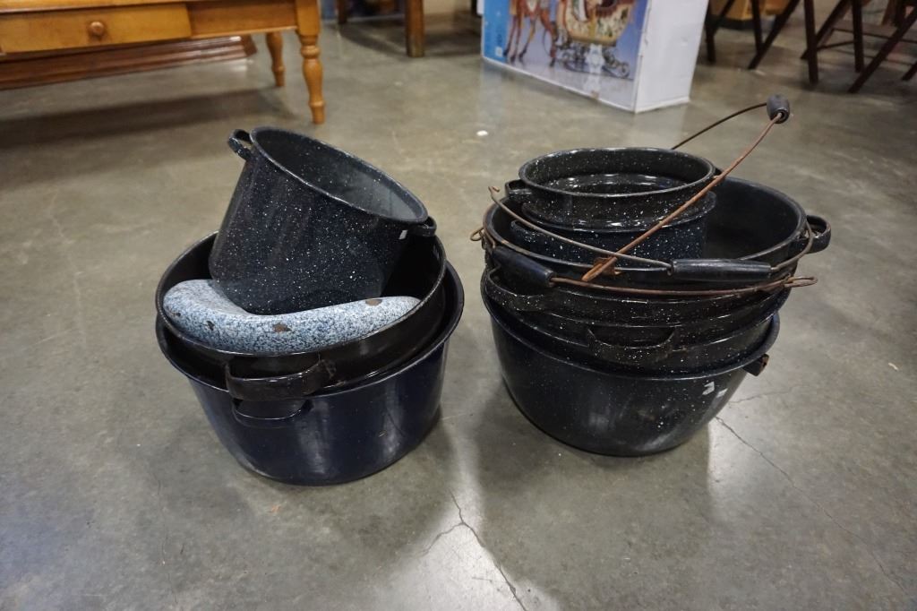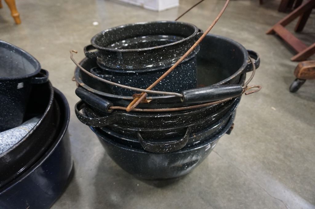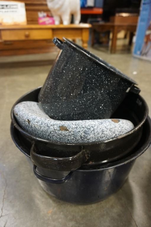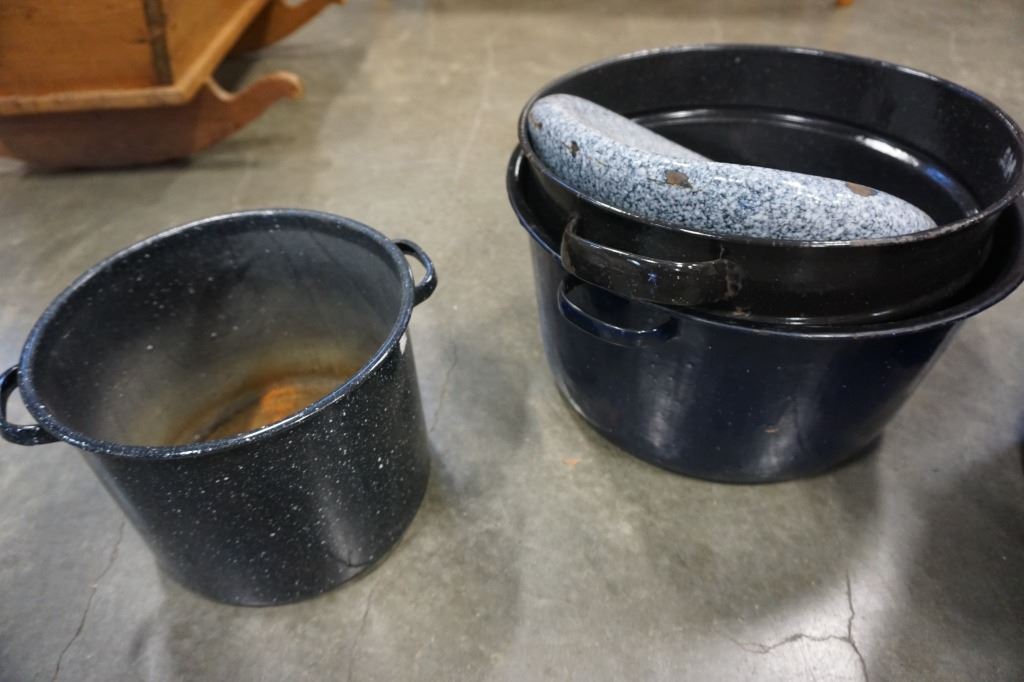 GRANITE WARE POTS AND WOOD DOLL CRIB