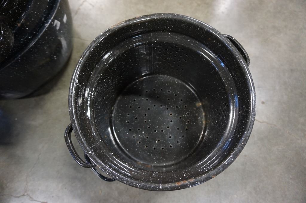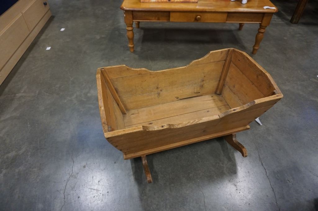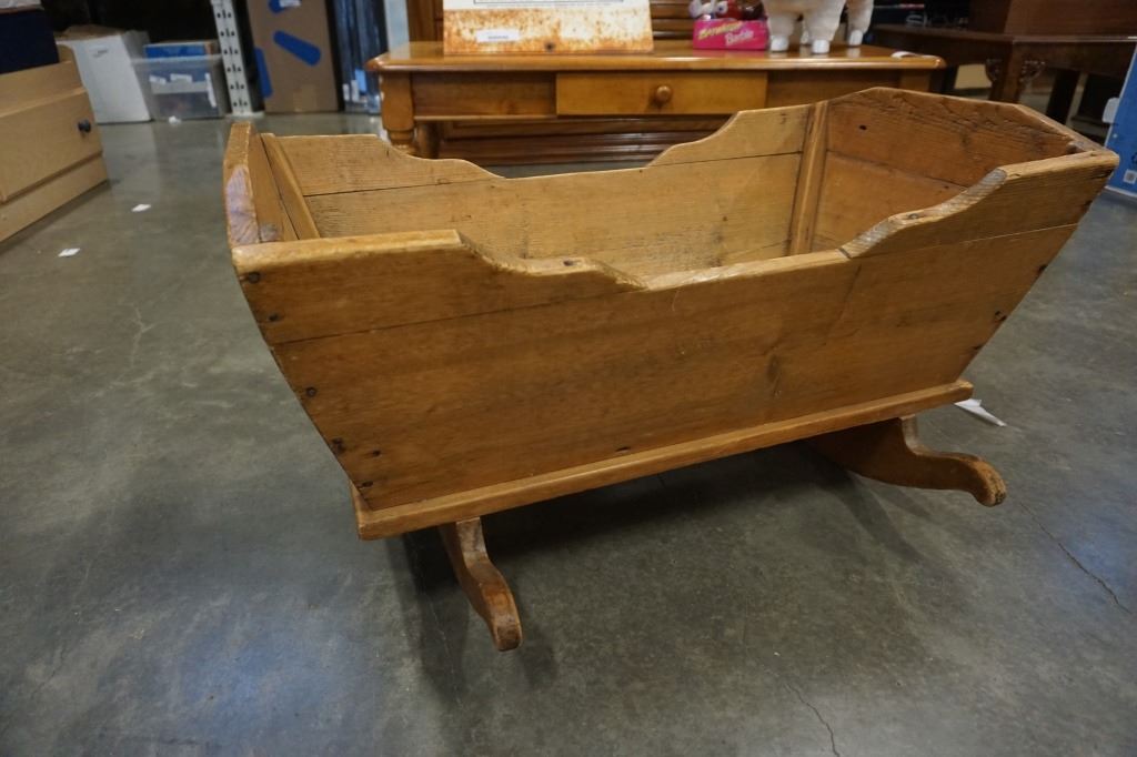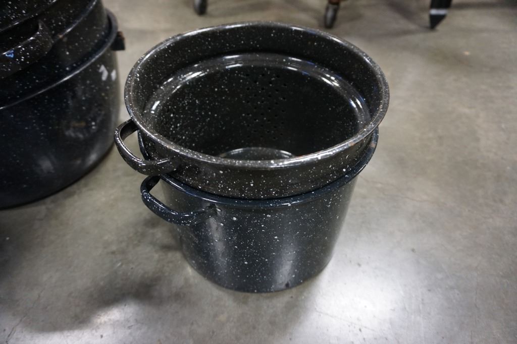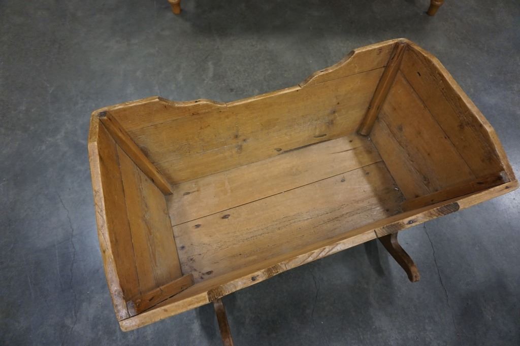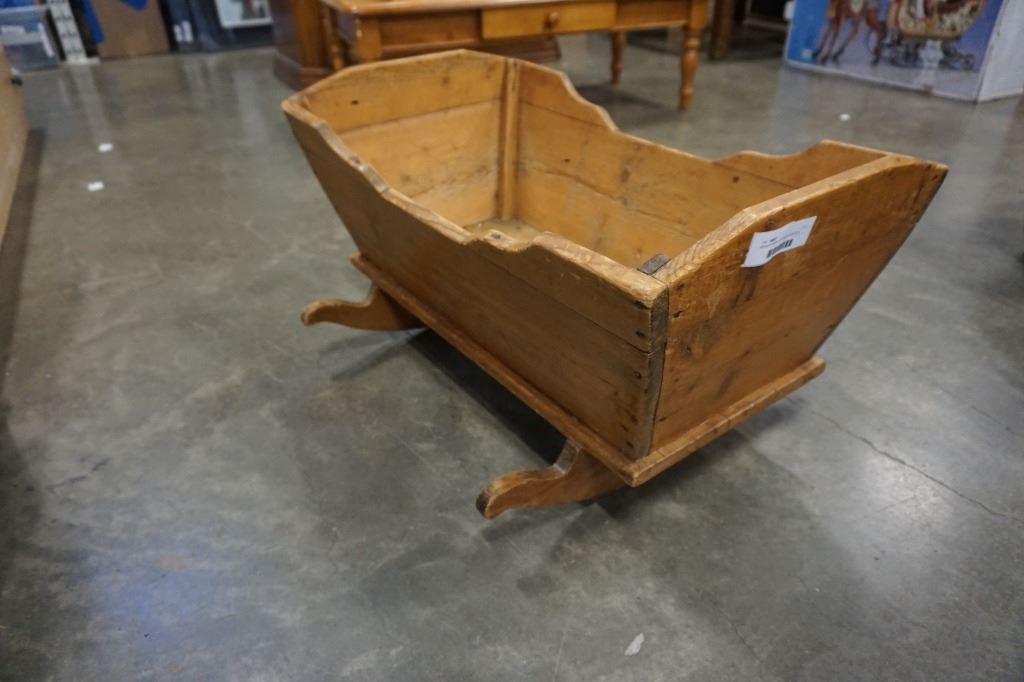 GRANITE WARE POTS AND WOOD DOLL CRIB